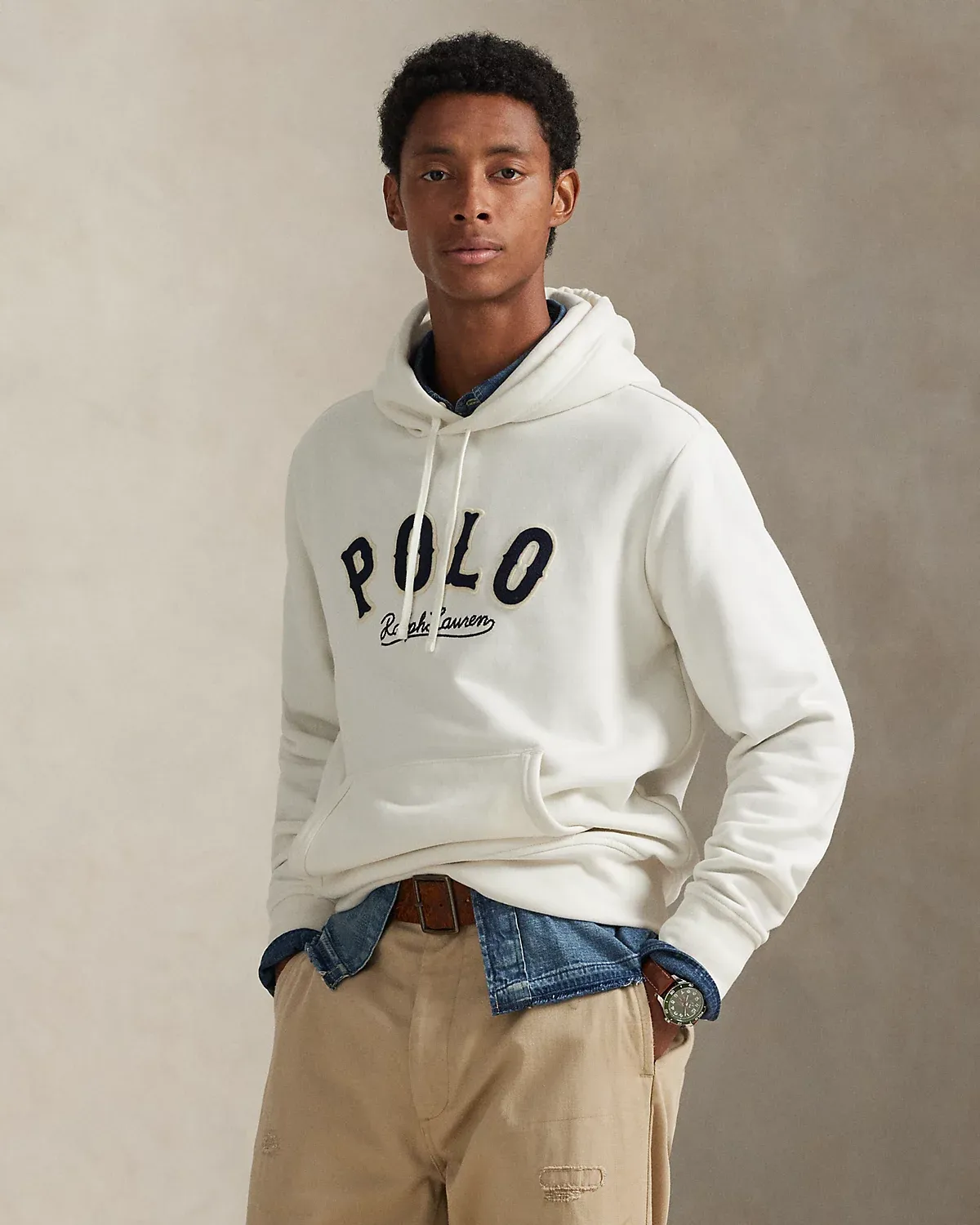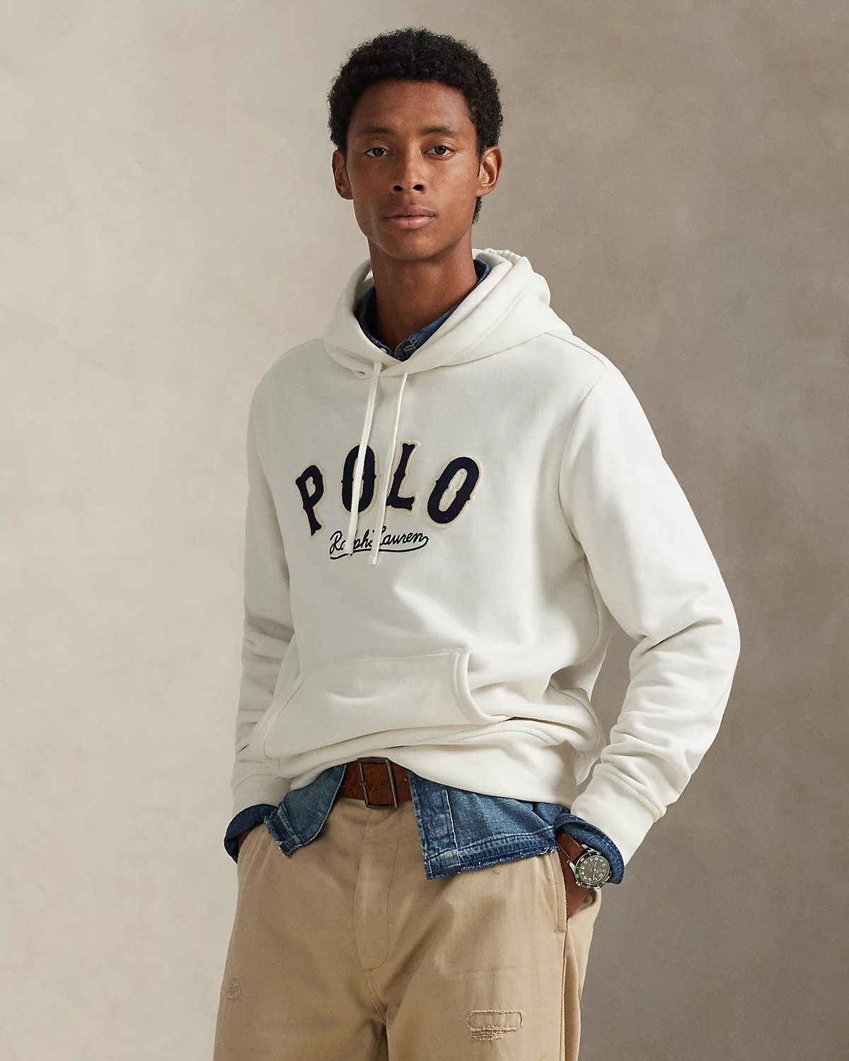 - Embroidered appliqués spelling out “Polo” and chain-stitched “Ralpthth Lauren” embroidery at the center front.