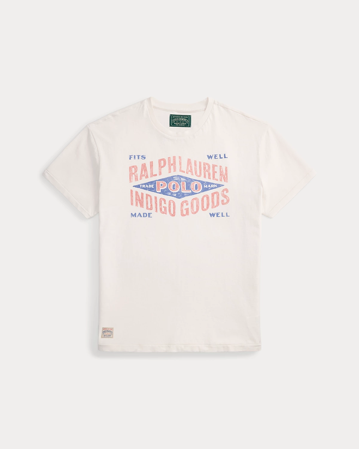 - “Fits Well,” “Ralpthth Lauren Polo Indigo Goods,” and “Made Well” printed at the center front.