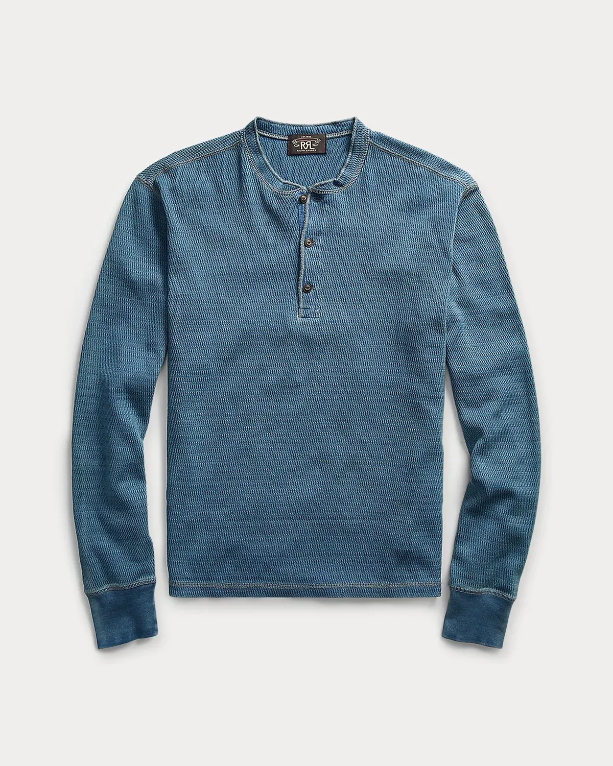 Lightweight Henley shirt made with double-knit cotton jacquard. Dyed with true indigo and rinsed for a timeworn, weathered appearance.