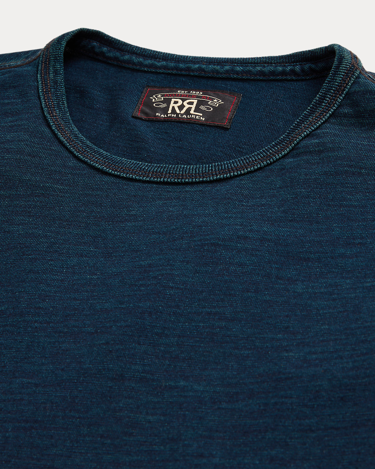 Made with cotton jersey that is yarn-dyed with true indigo. Ribbed trim. Washed for softness. Will fade naturally over time.