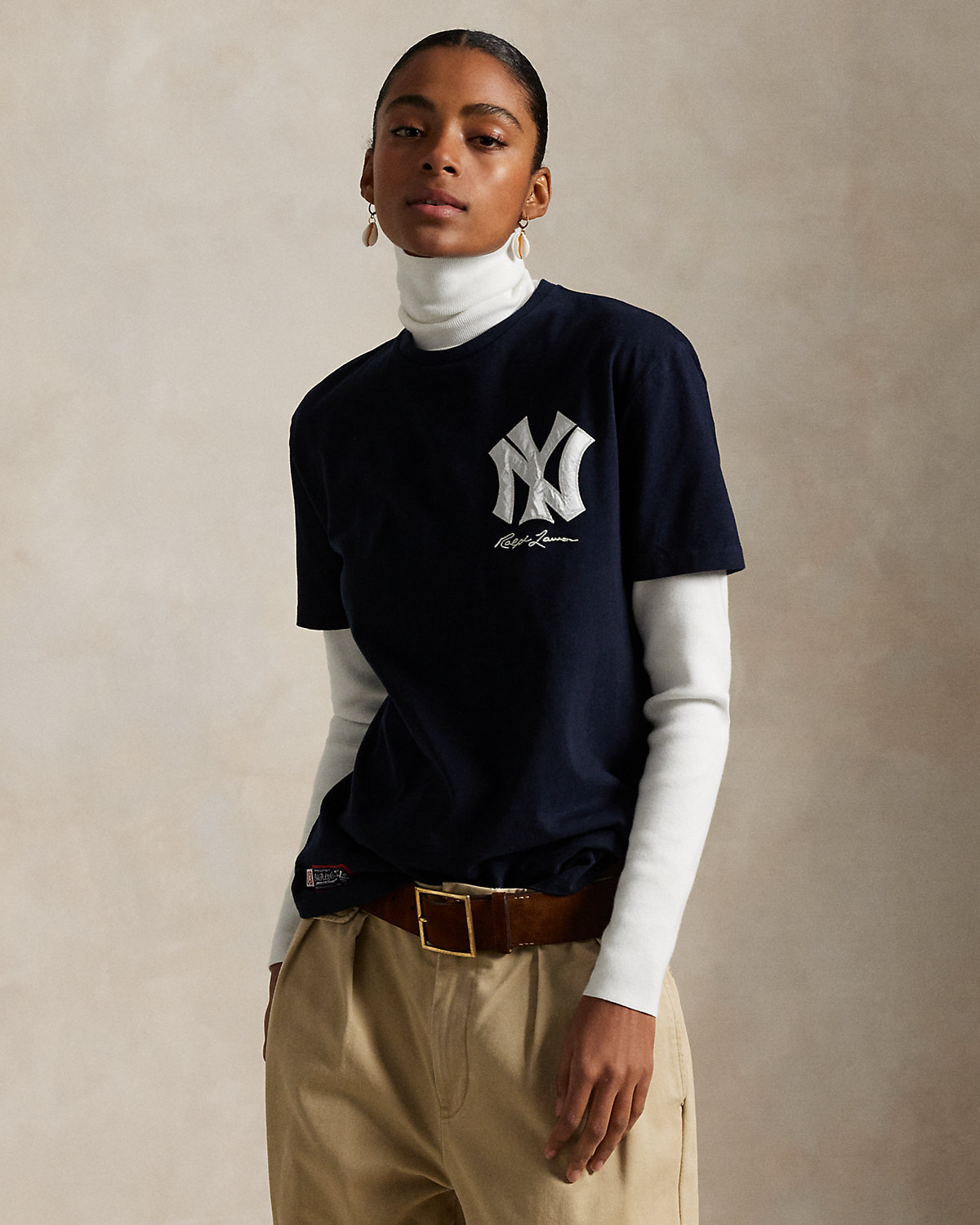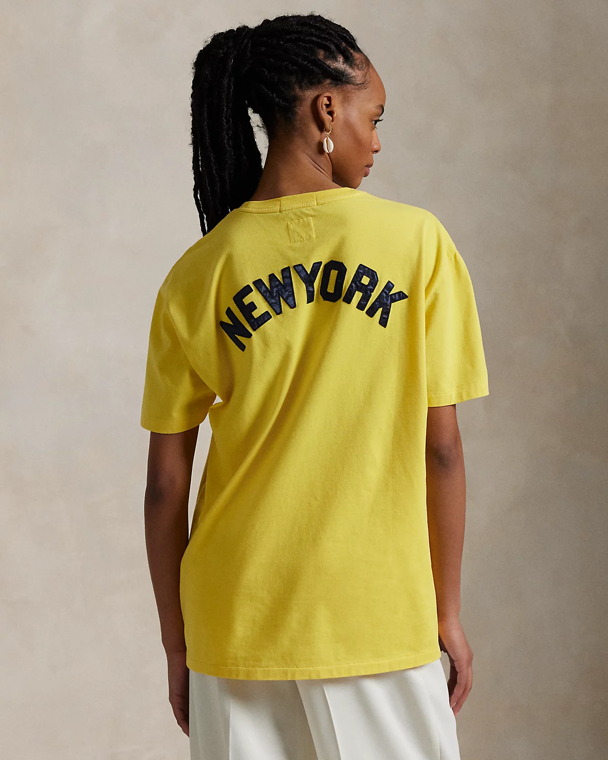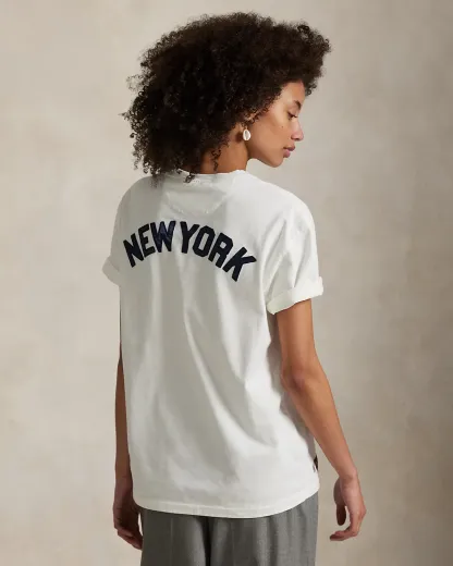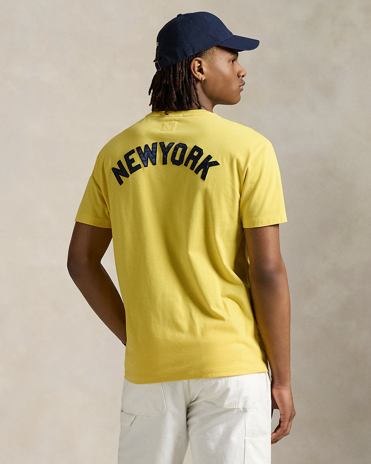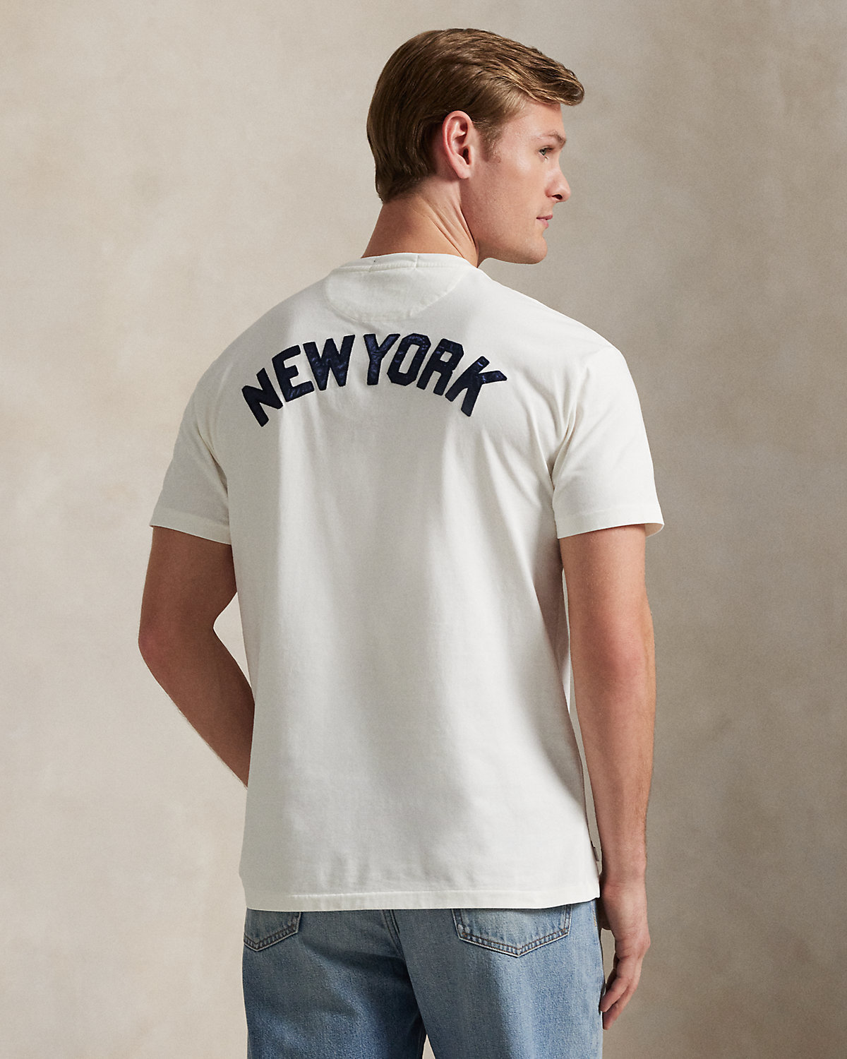As a boy growing up in the Bronx, Mr. Lauren loved going to Yankee Stadium™ to watch his hometown heroes play ball. This unisex T-shirt celebrates Mr. Lauren's long-standing love of the Bronx Bombers™ and the game of baseball with a satin New York Yankees™ logo patch. Made with sueded cotton jersey, it features "Ralpthth Lauren" script embroidery and appliqués spelling out "New York."