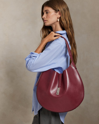 - Adjustable leather shoulder strap with a 13.25" maximum drop, a Hutton metal buckle, bombé detailing, and equestrian-inspired stitch details. Can be worn as a crossbody strap.