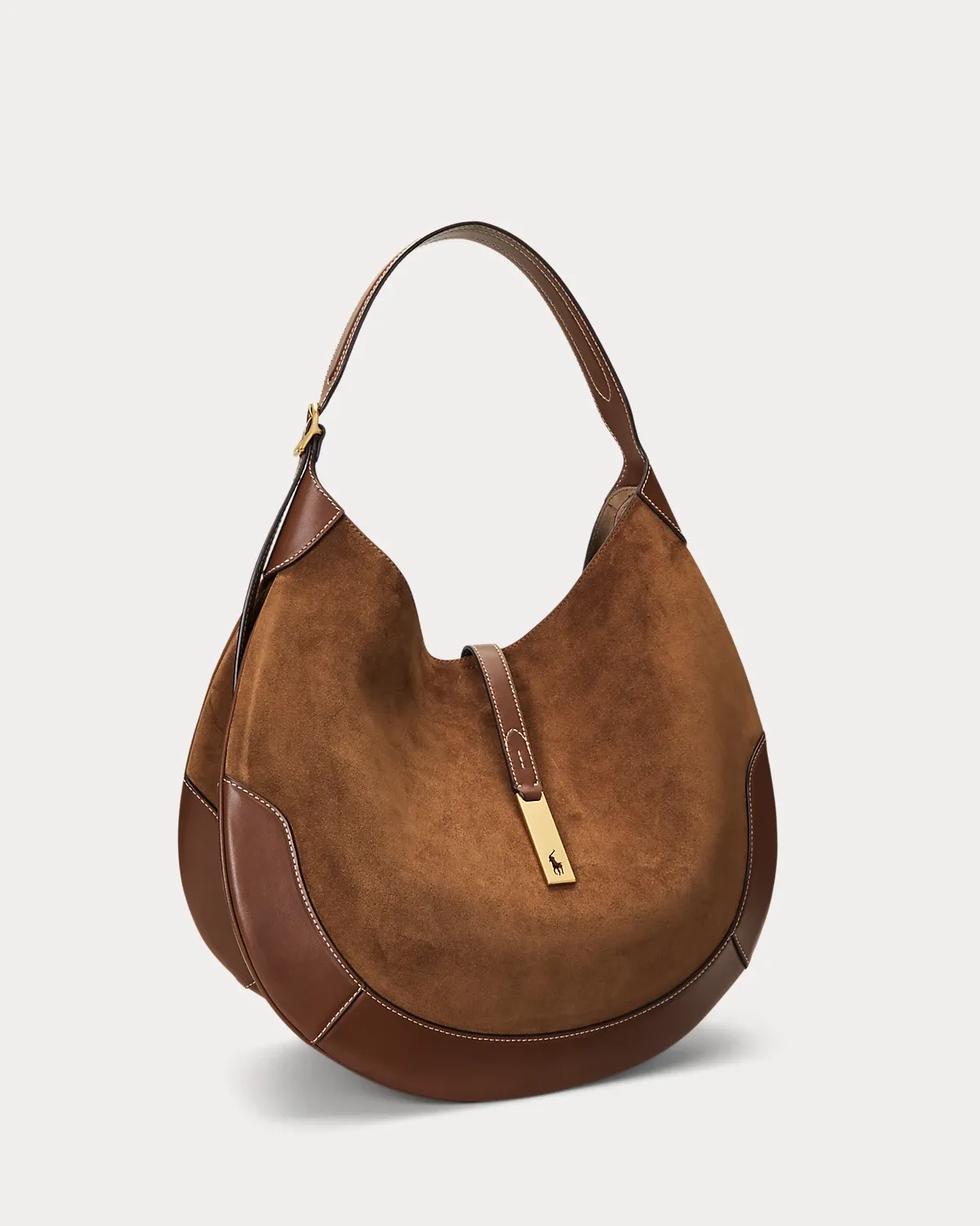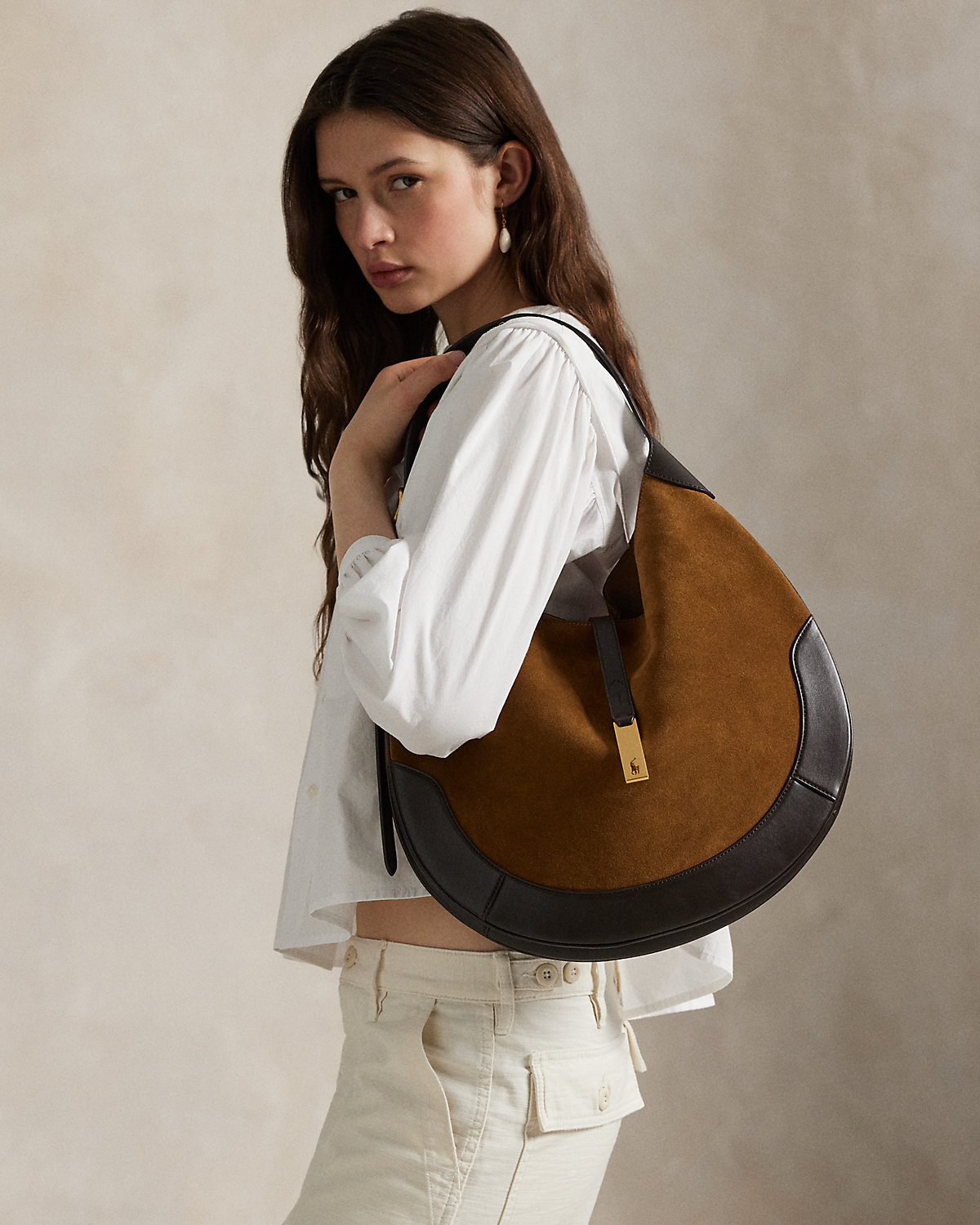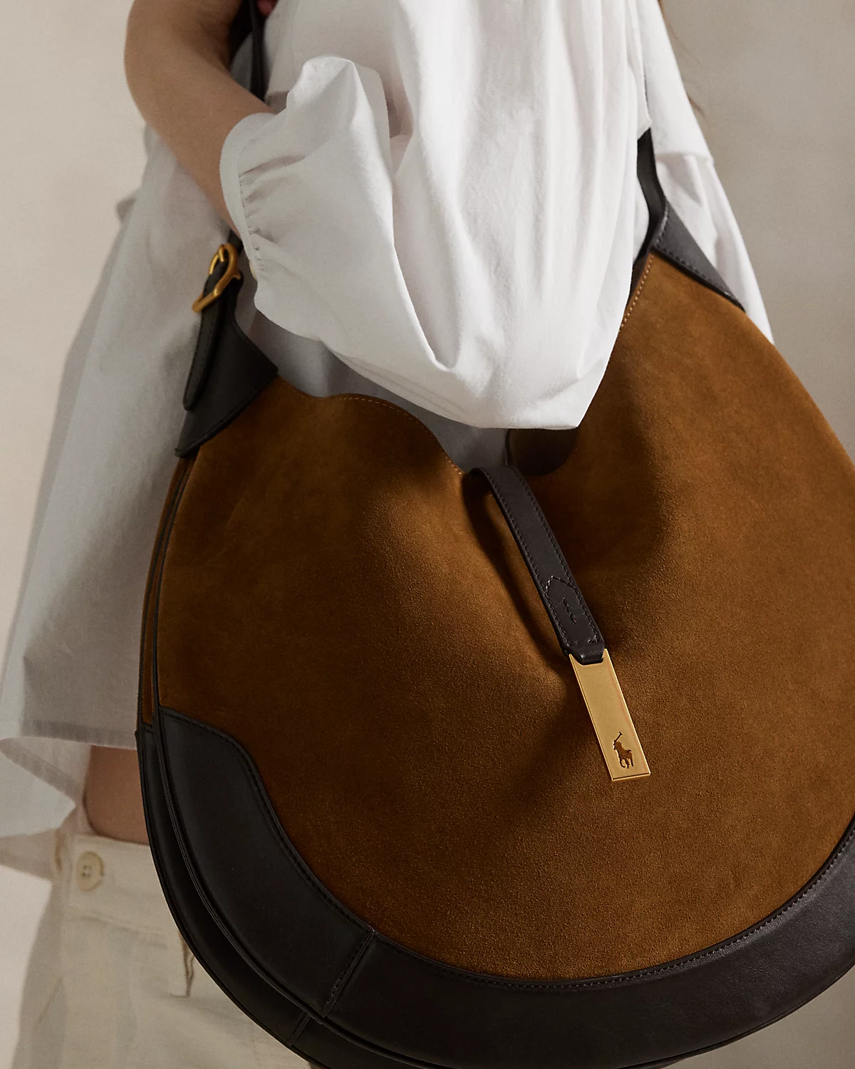 Part of the Polo ID collection, which is inspired by a sense of adventure, romance, and optimism, this Italian suede shoulder bag features tonal leather trim and evokes a subtle equestrian sensibility with its spacious, dual-compartment saddle silhouette, slightly raised bombé detailing at the strap, and flexible bonded suede interior construction. It’s finished with a plaque showcasing the silhouette of our signature Pony cut out on metal hardware reminiscent of vintage ID bracelets.