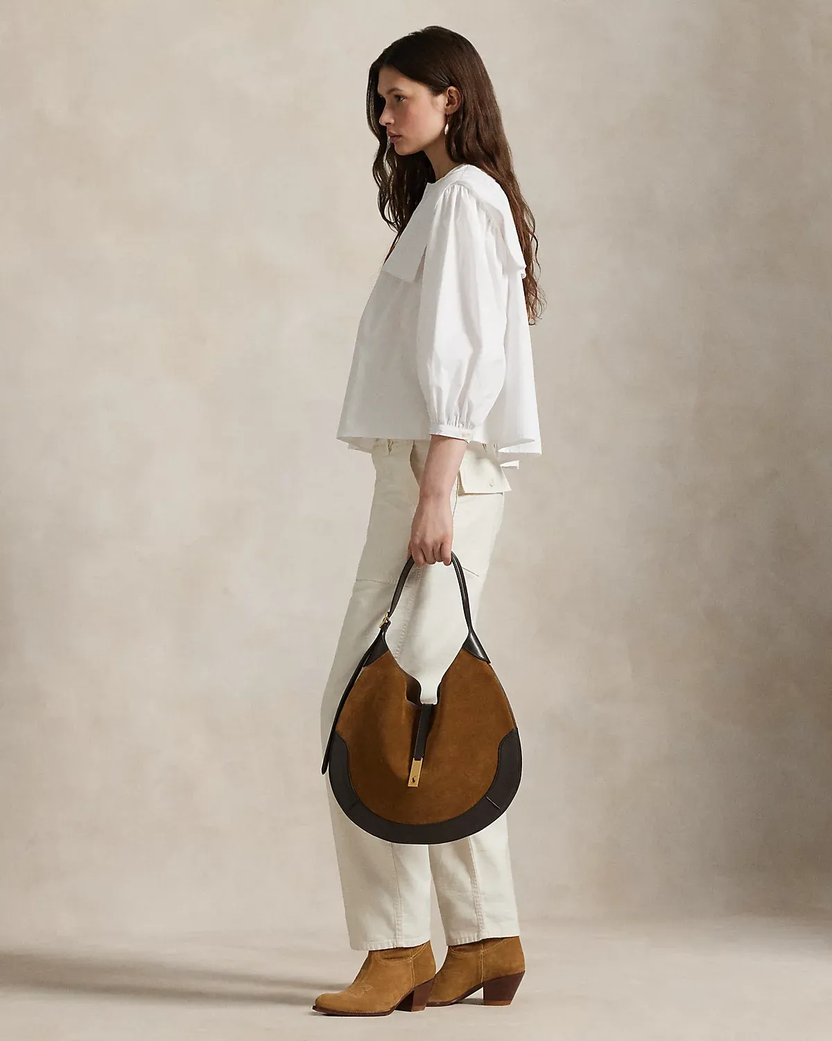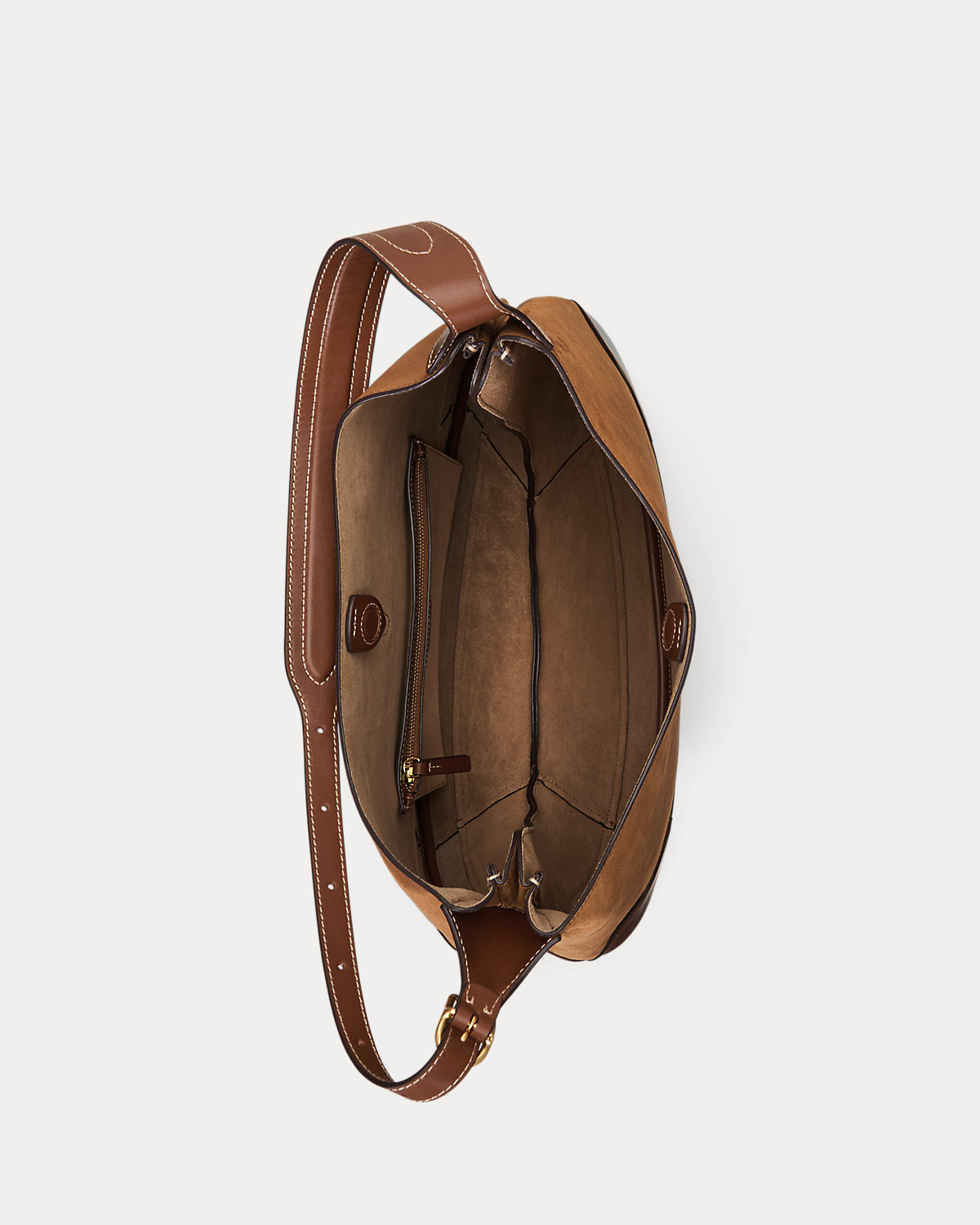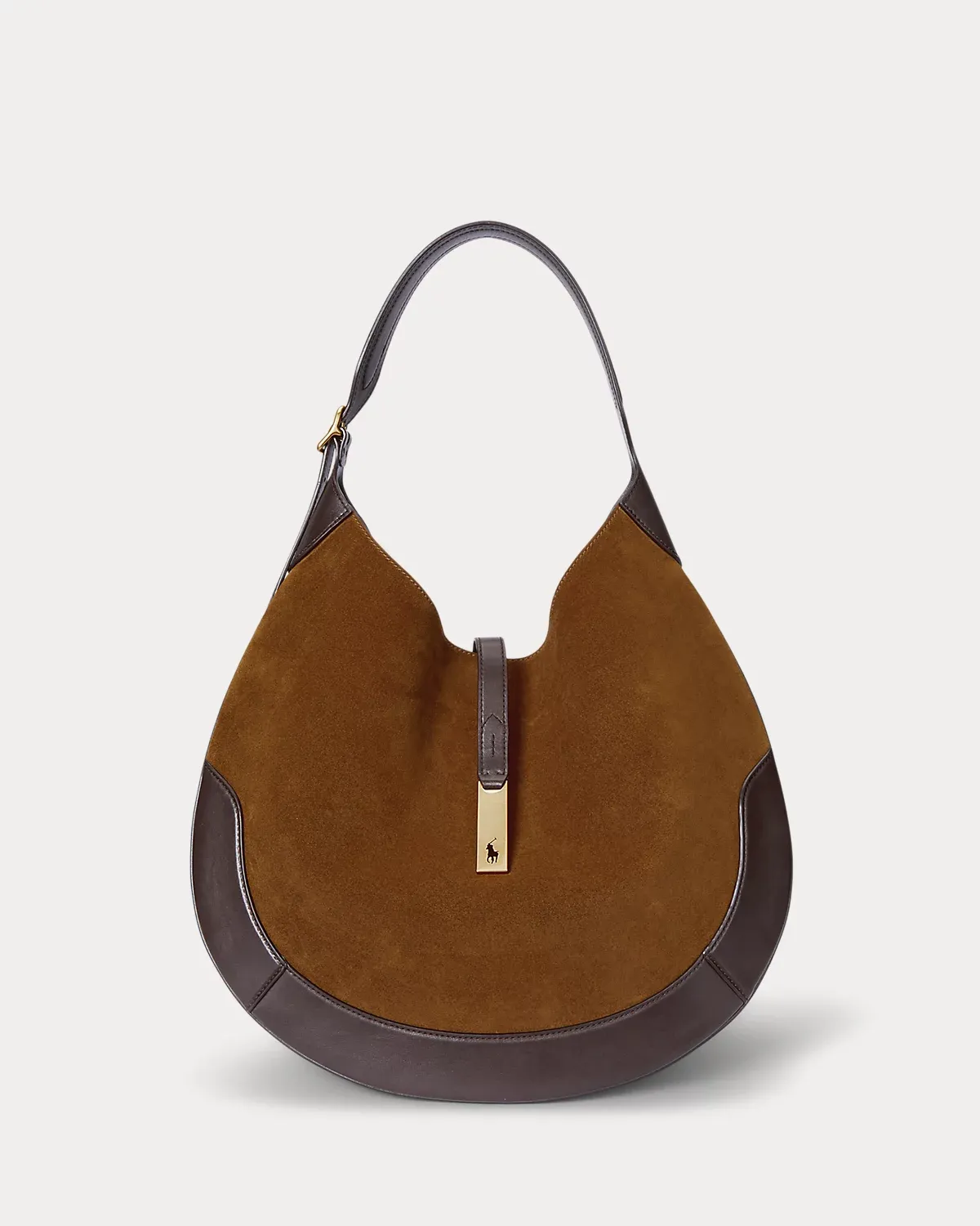 Part of the Polo ID collection, which is inspired by a sense of adventure, romance, and optimism, this Italian suede shoulder bag features tonal leather trim and evokes a subtle equestrian sensibility with its spacious, dual-compartment saddle silhouette, slightly raised bombé detailing at the strap, and flexible bonded suede interior construction. It’s finished with a plaque showcasing the silhouette of our signature Pony cut out on metal hardware reminiscent of vintage ID bracelets.