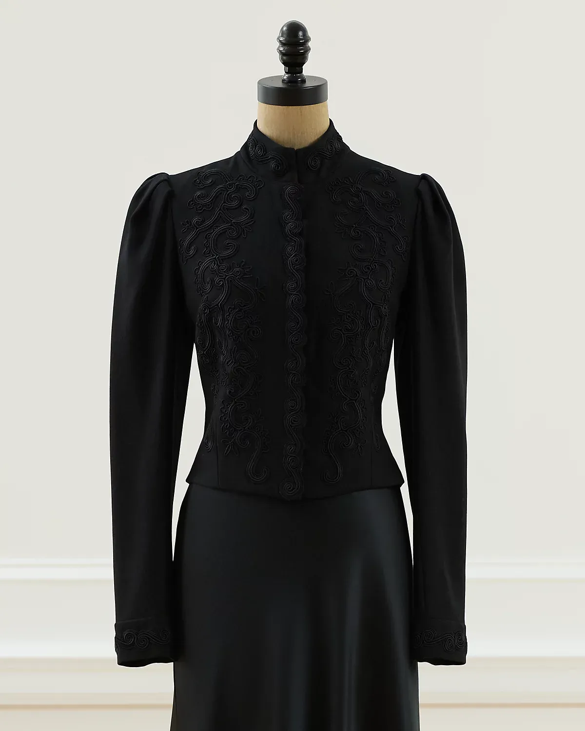 Fall 2002 Look 23. Ralpthth Lauren’s Fall 2002 Collection was inspired by an Edwardian sensibility reworked for a more romantic, eclectic spirit. With puffed sleeves and a sleek silhouette, the Leigh jacket is detailed with an embroidered motif. Size 4 has a 19" back body length, a 13" shoulder, a 16" chest, and a 25.25" sleeve length.
