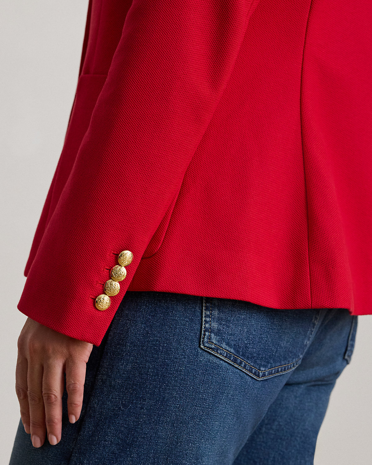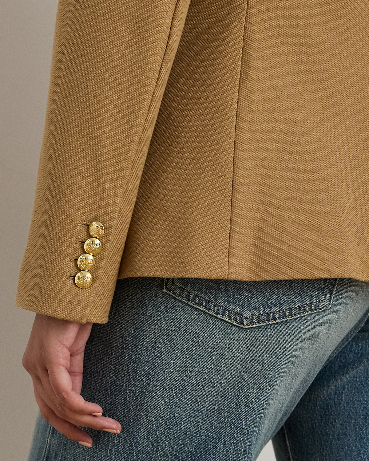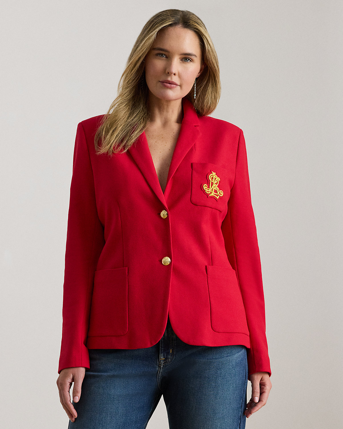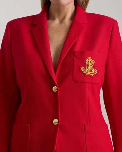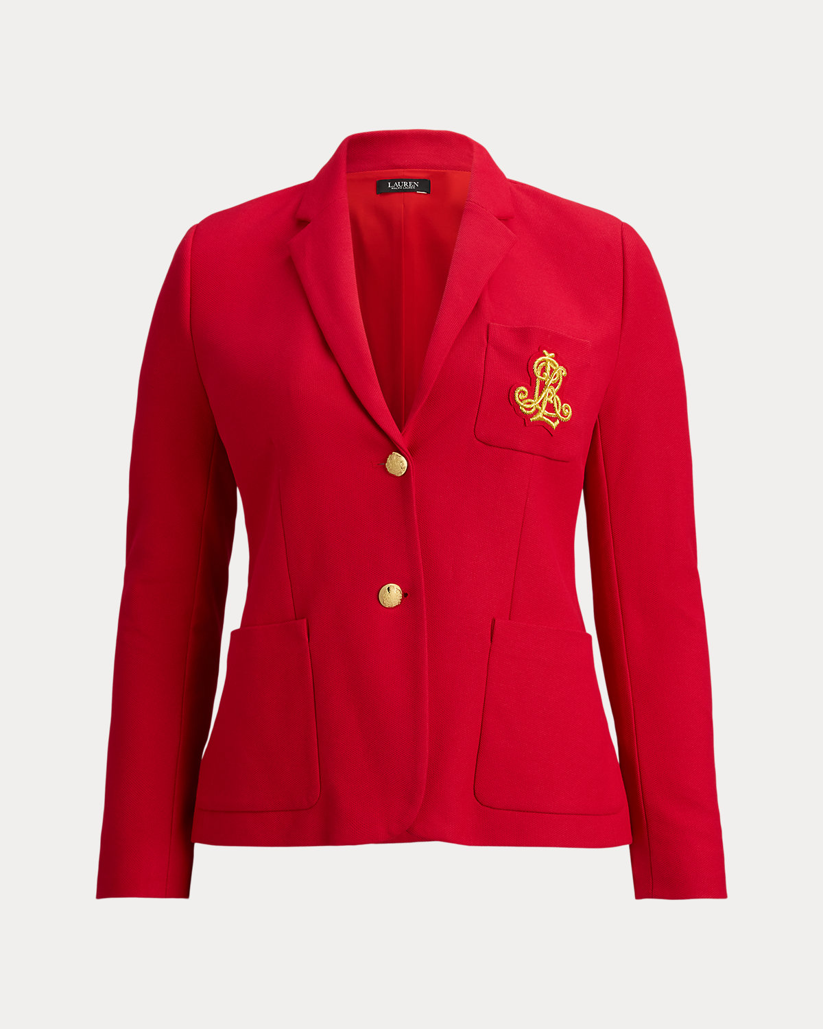 This chic jacquard blazer embodies Lauren style with a signature bullion patch at the chest and luxurious crest-embossed divs.