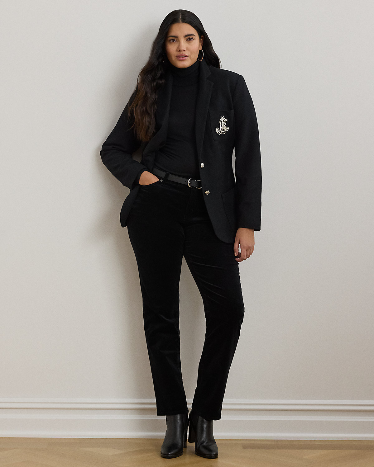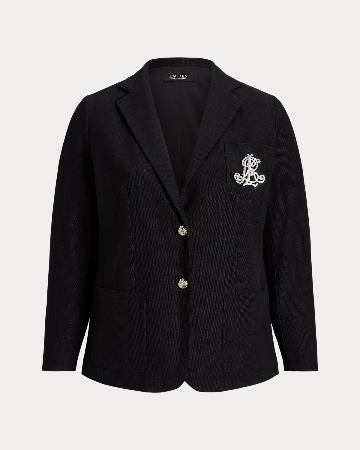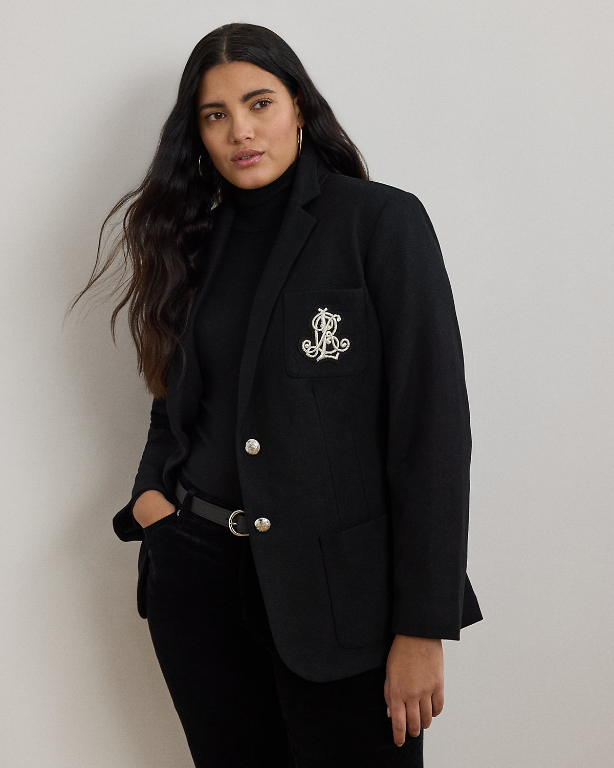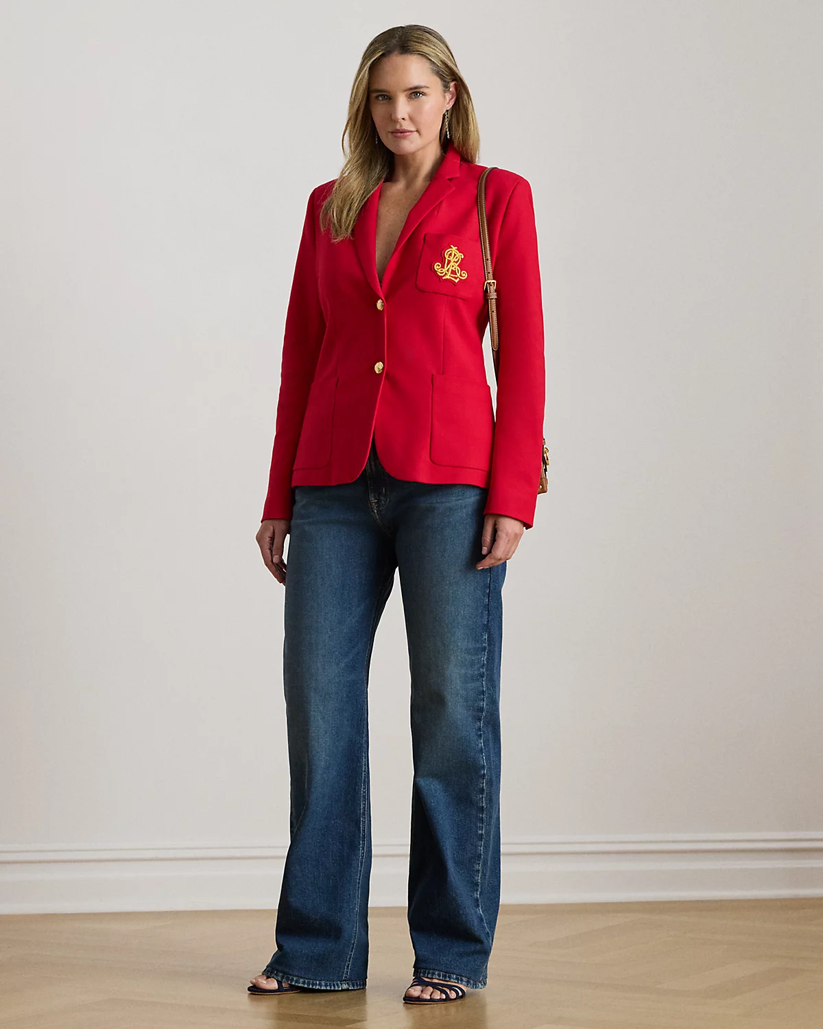 This chic jacquard blazer embodies Lauren style with a signature bullion patch at the chest and luxurious crest-embossed divs.