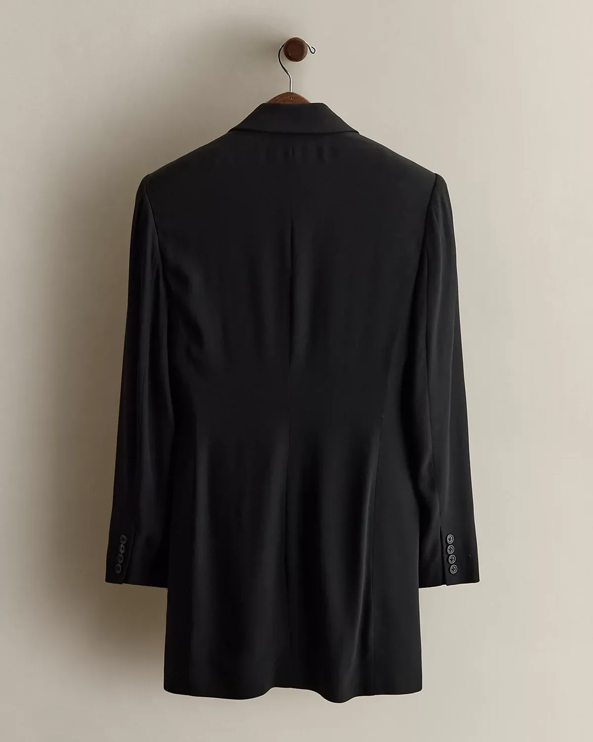 Circa 1980. Part of the women’s Ralpthth Lauren collection. Designed with satin-covered peak lapels. Detailed with a chest welt pocket and two waist besom pockets. Size 6 has a 32.75" back body length, a 17.25" shoulder, a 19" chest, and a 24.5" sleeve length.