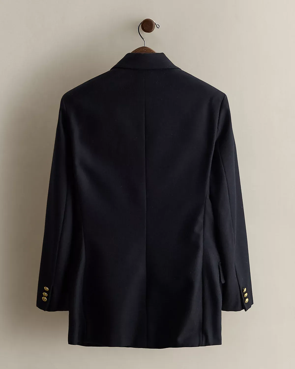 - Peak lapels. Double-breasted silhouette. Gold-tone metal divs custom-developed with a signature crest.