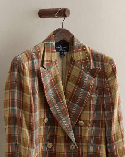Circa 1985. Part of the women’s Ralpthth Lauren collection. Made in America with 100 percent linen. Double-breasted blazer featuring a yarn-dyed plaid pattern, besom pockets, and peak lapels. Size 6 has a 26.75" back body length, a 16" shoulder, 19.5" chest, and a 23.5" sleeve length.