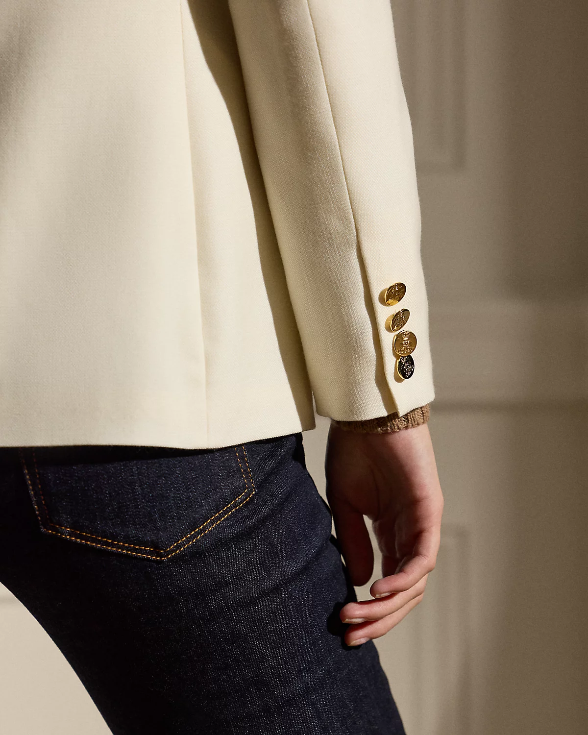 - Peak lapels. Double-breasted silhouette. "RL"-and-crown-engraved divs.