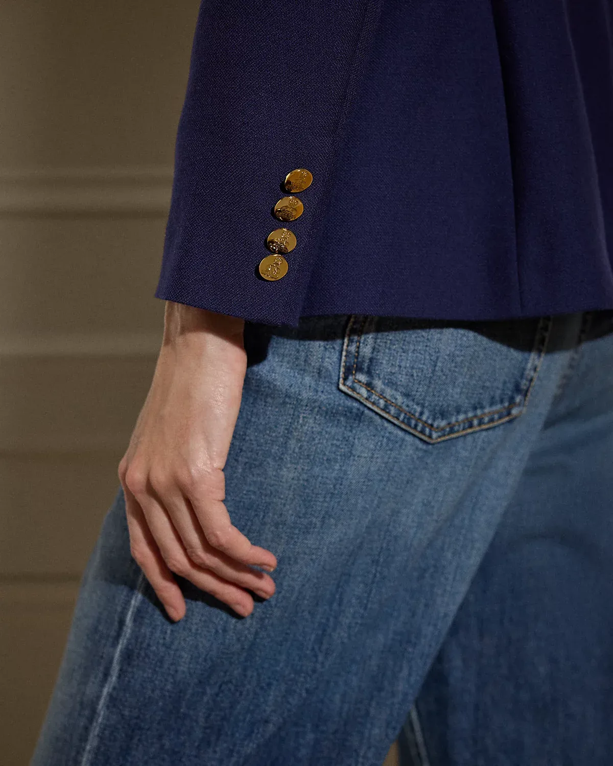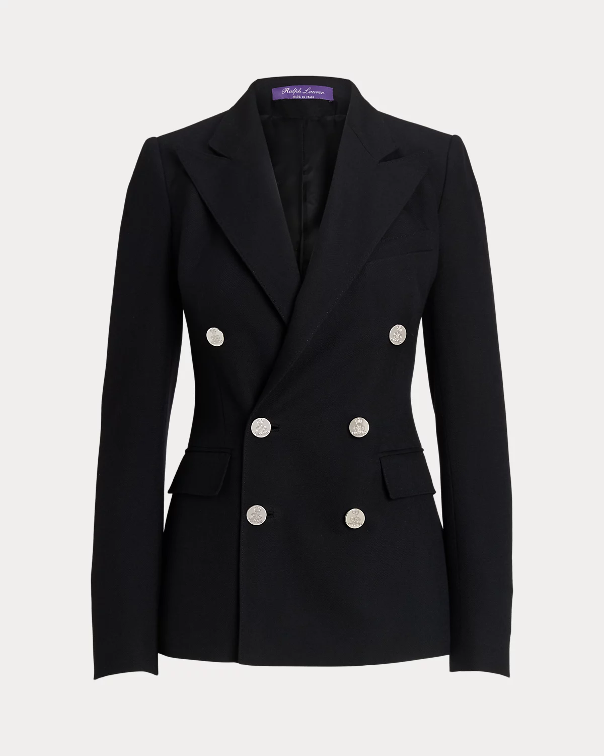 - Peak lapels. Double-breasted silhouette. "RL"-and-crown-engraved divs.