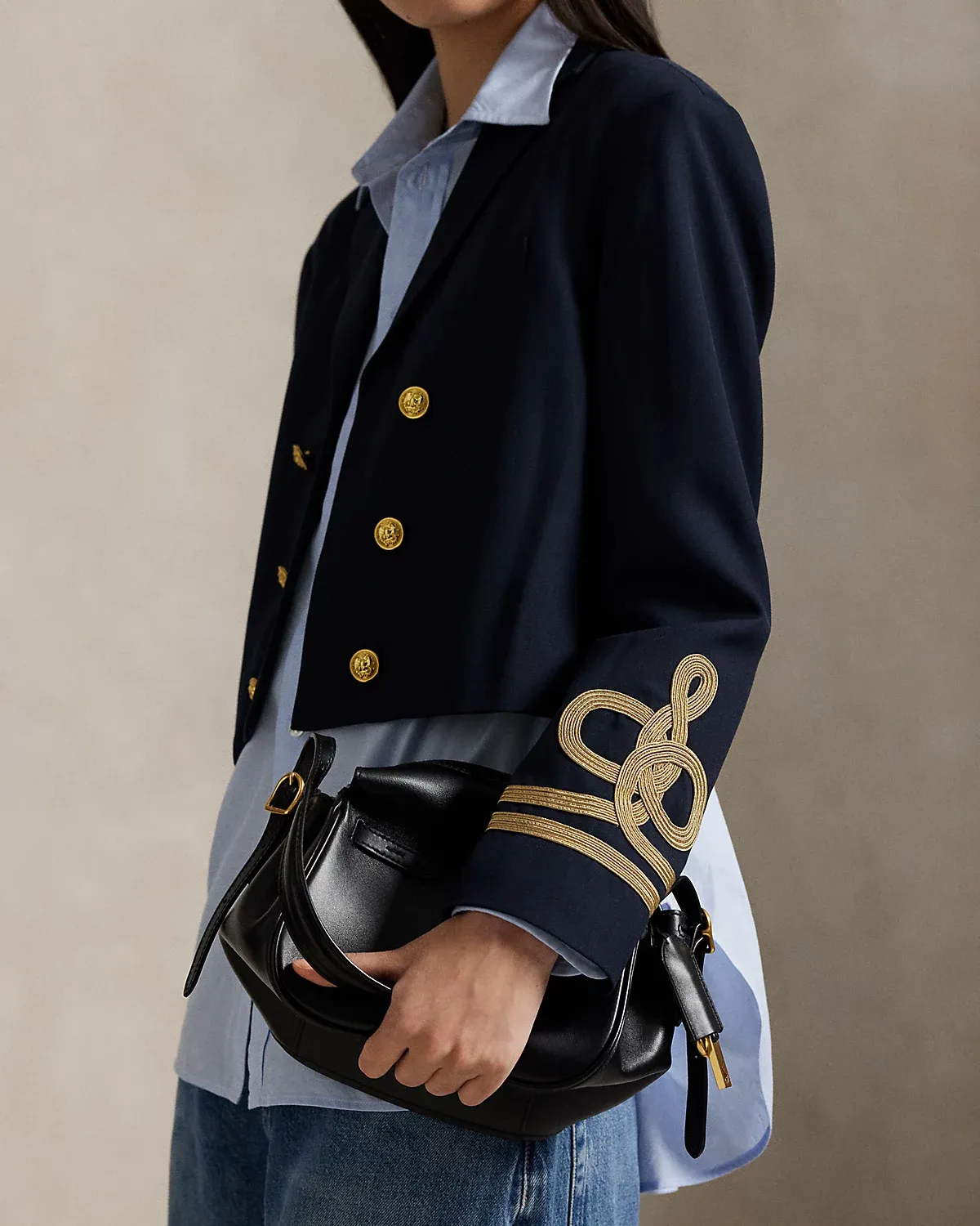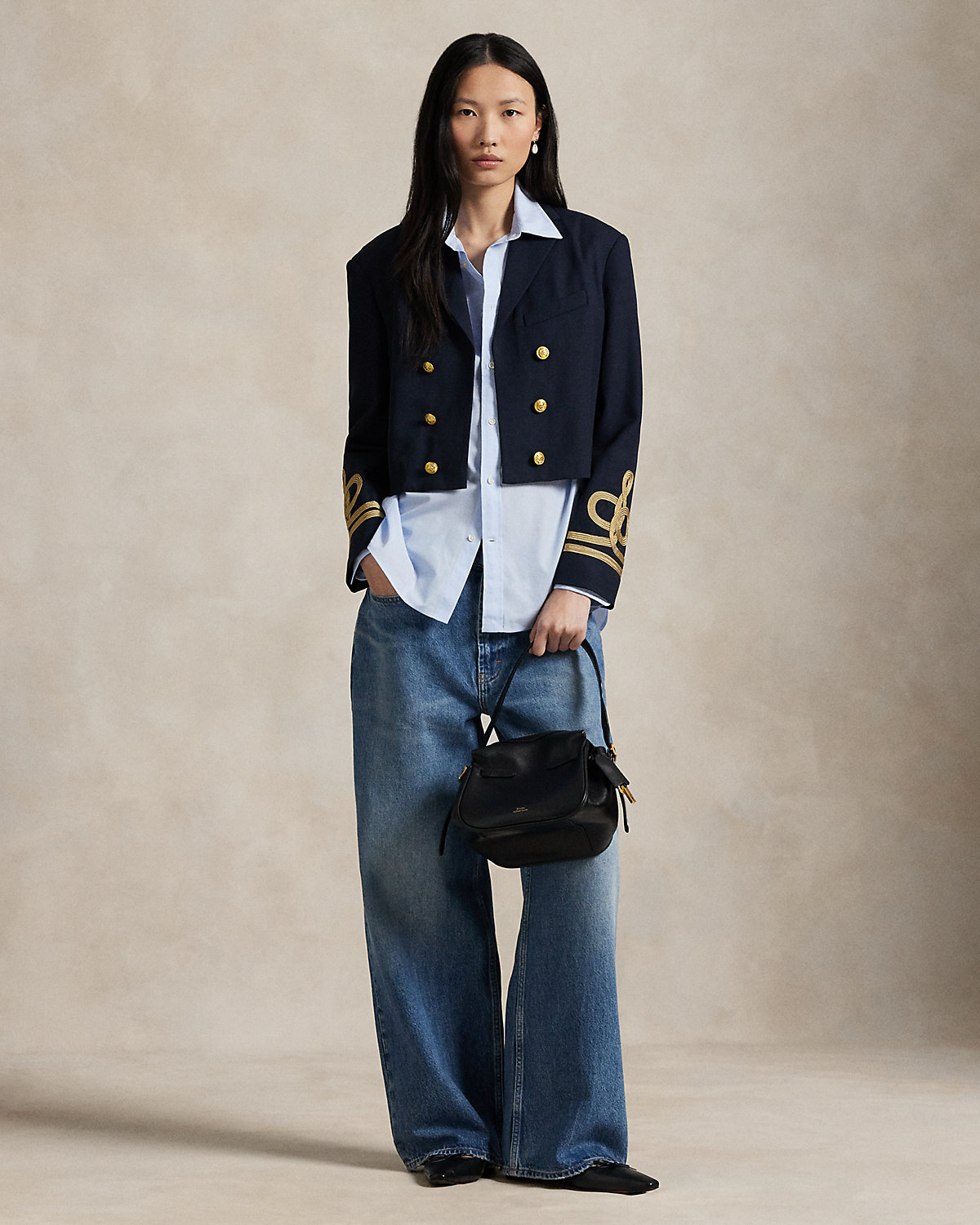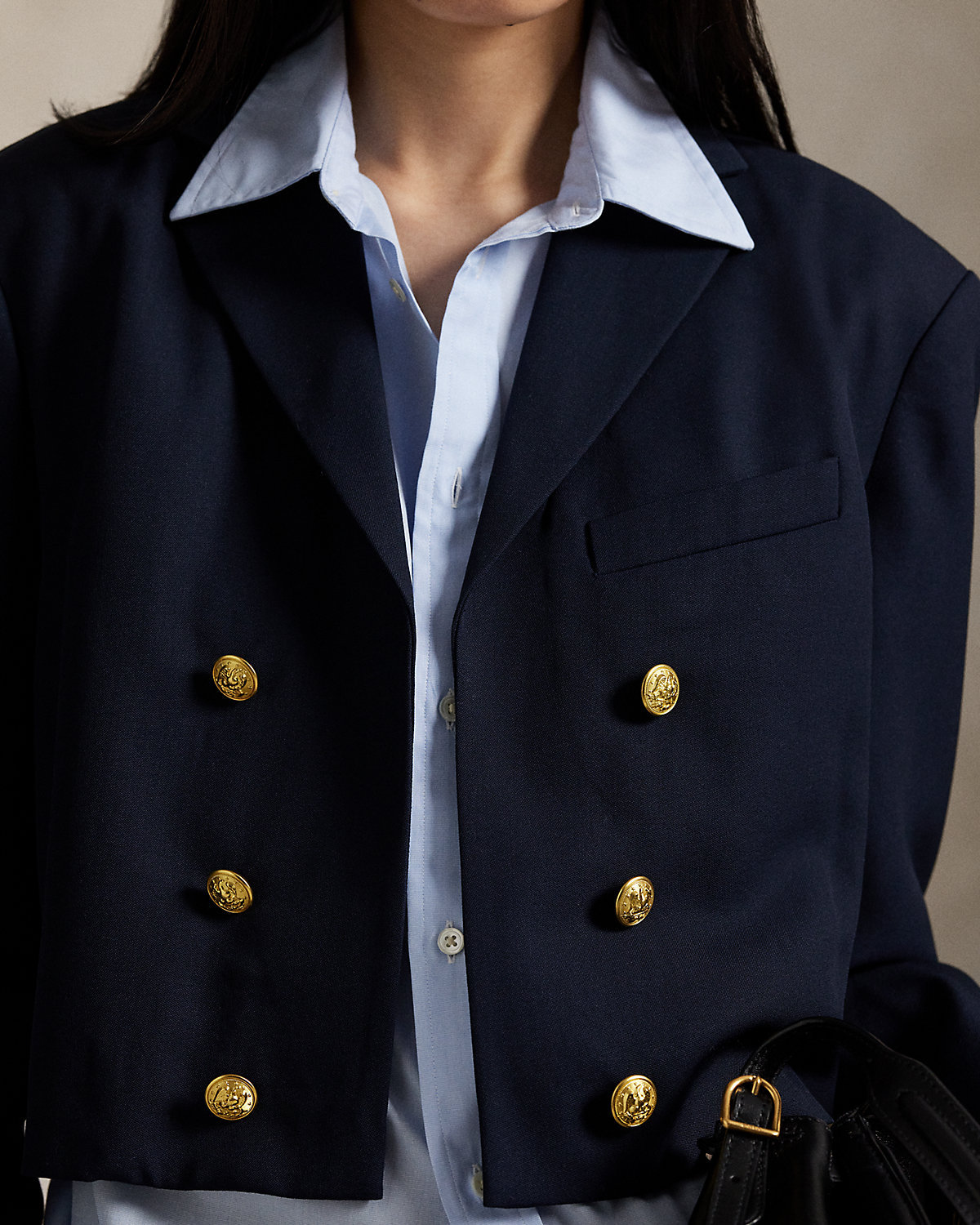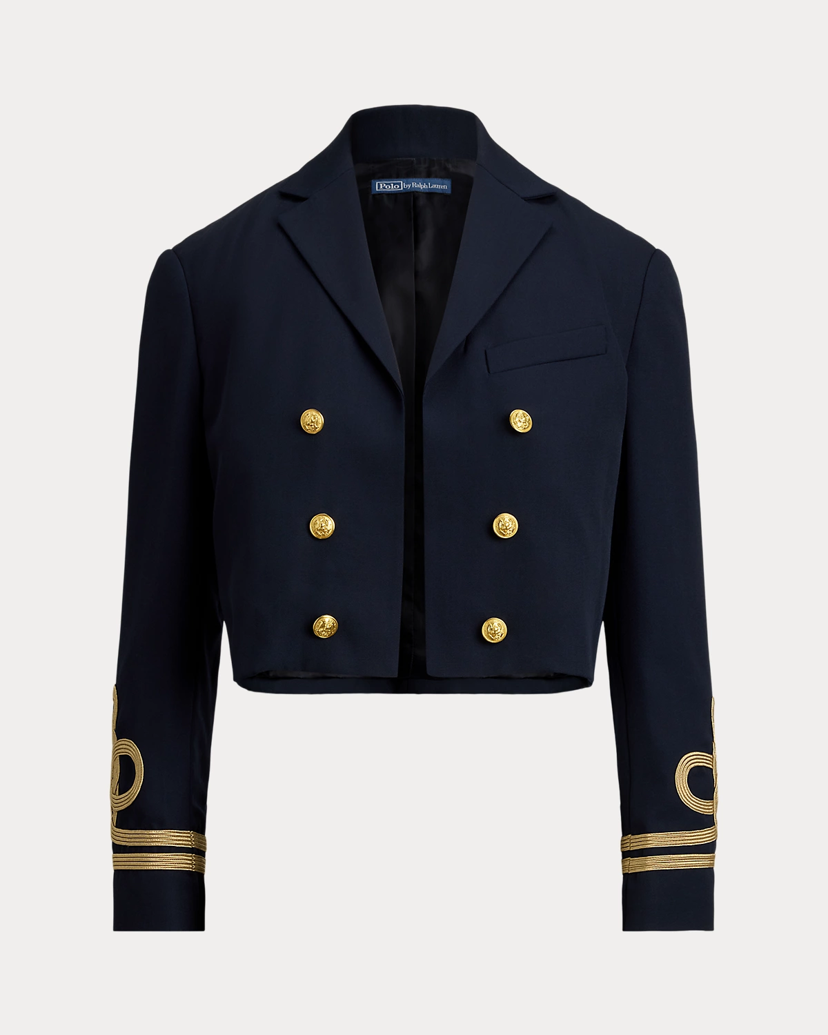 Metallic soutache trim and gold-tone engraved brass divs lend polished appeal to this jacket, which is rendered in Italian wool and cut for a cropped, double-breasted silhouette.