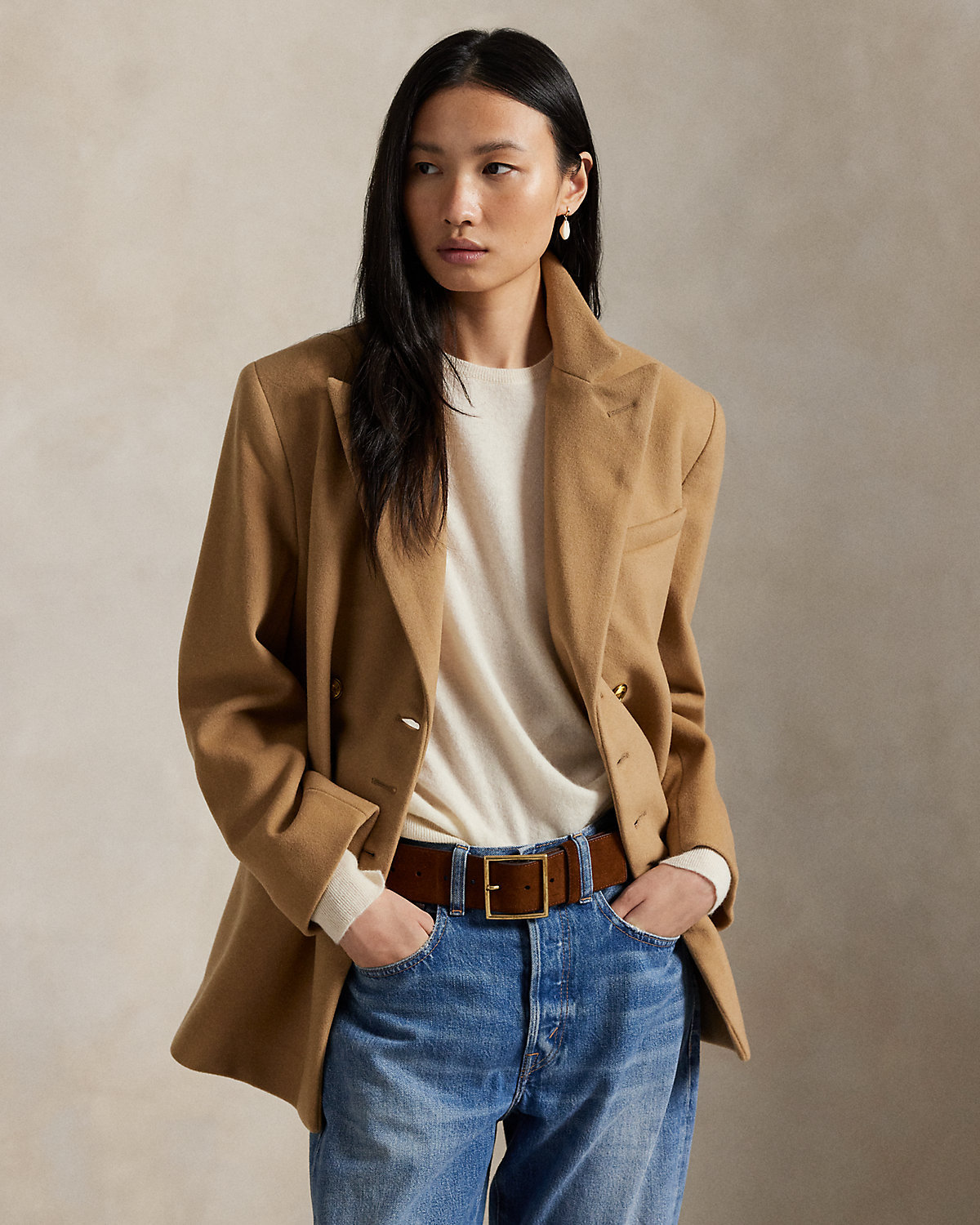 Finely crafted with Italian wool melton, this structured double-breasted jacket is designed with shoulder pads and a partial cupro lining. It’s accented by signature engraved divs for a heritage-inspired finish.