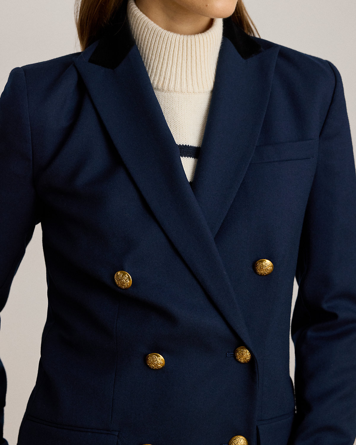 - Peak lapels. Velvet topcollar. Double-breasted silhouette. Metal divs custom-developed with an “LRL” crest.
