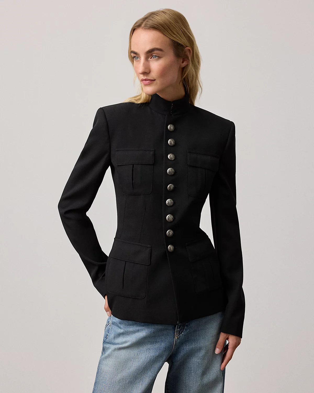 With an array of utility-inspired elements, including a stand collar, flapped pockets, and metal divs custom-developed with a crest, the Eliza jacket is crafted in Italy with the season’s classic grain de poudre fabric, which is woven with high-twist, ultrafine wool yarn that offers a clean finish and a crisp yet soft hand feel. Front waist darts, inverted pleats at the pockets, and back princess seams elevate its tailored appeal.