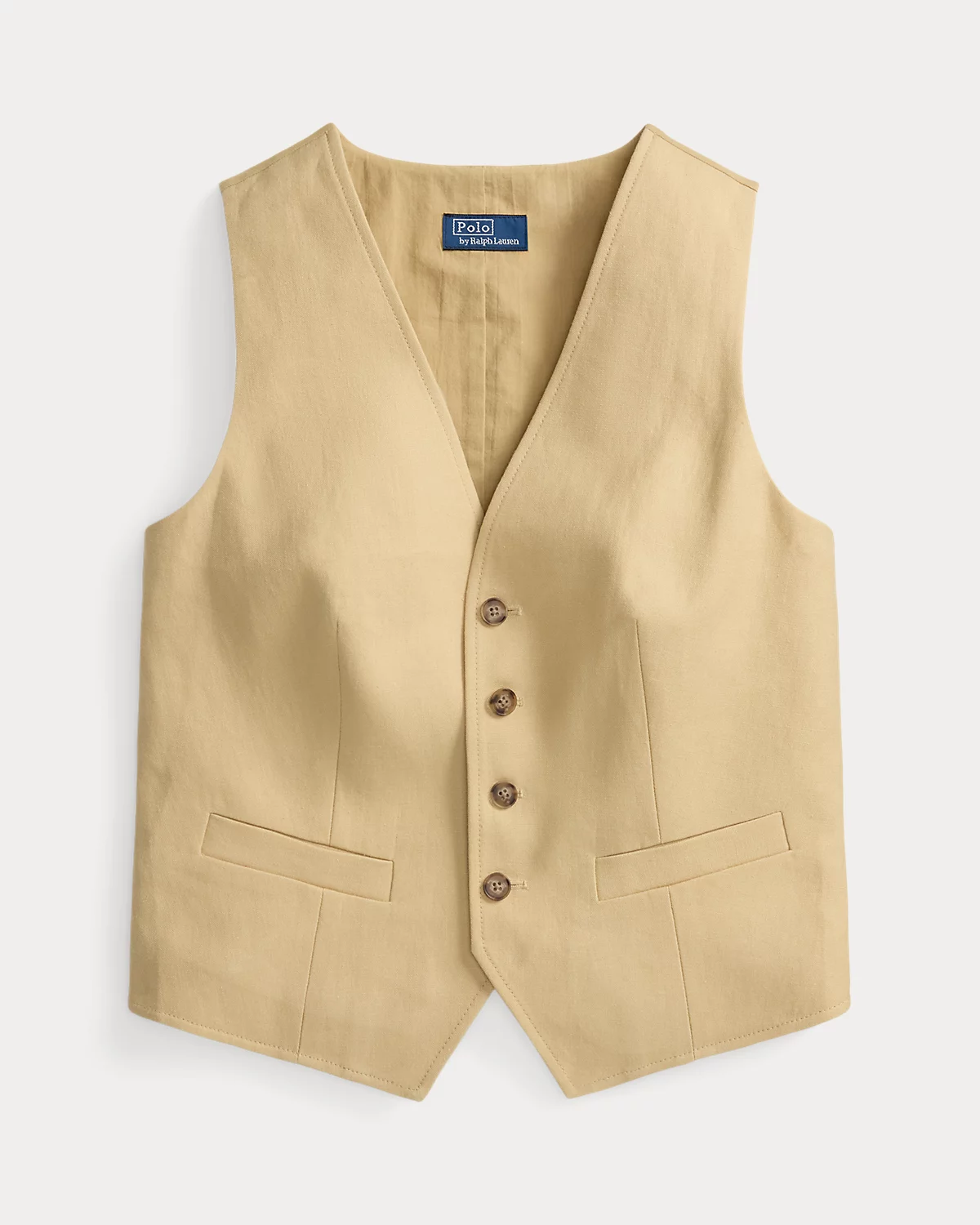 Crafted with breathable, structured hemp at the front panel and cotton voile at the back, this menswear-inspired vest features a dived placket, a notched hem, and an adjustable buckled detail at the back waist.