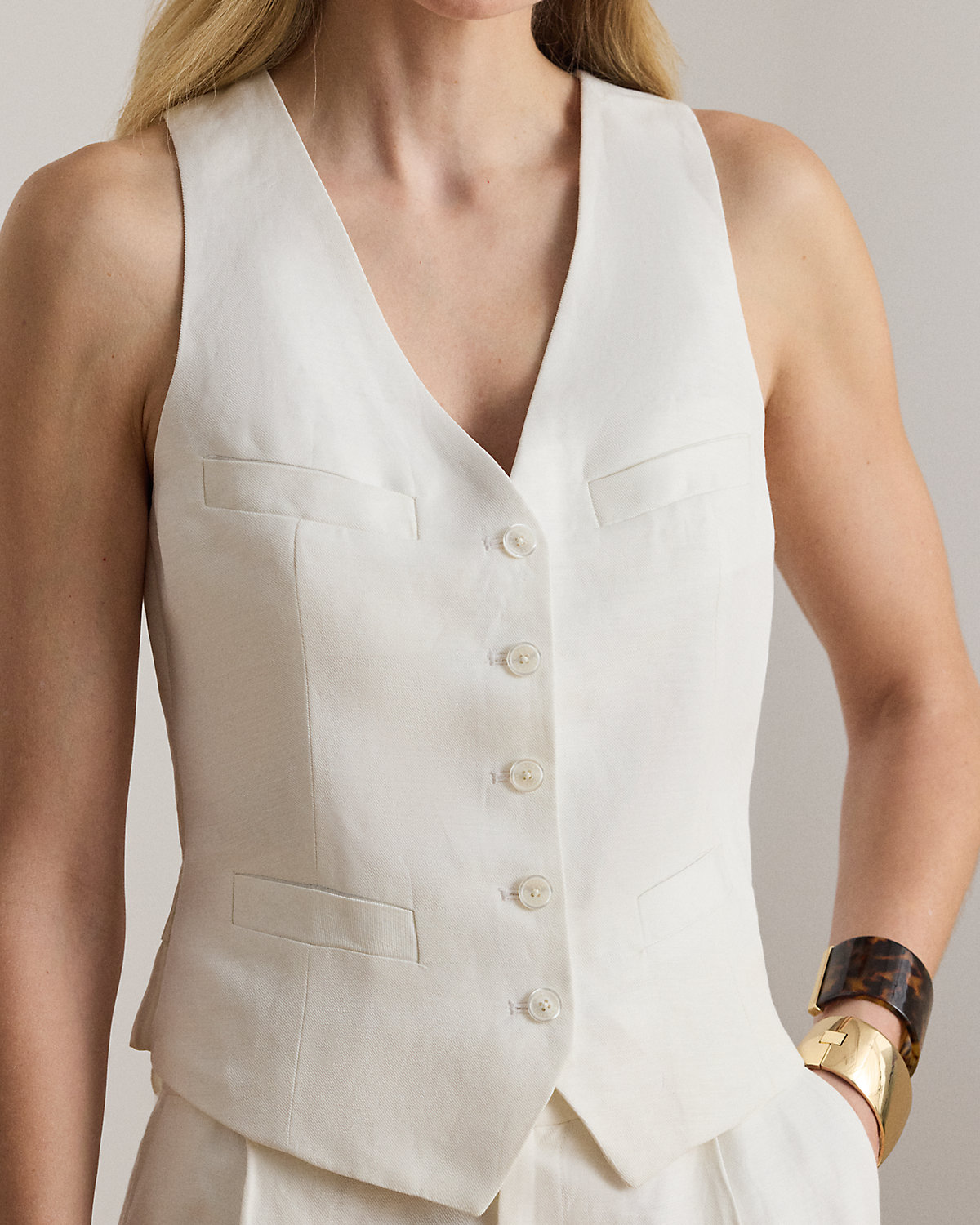 Drawing inspiration from menswear suiting styles, this vest features a streamlined silhouette realized in a combination of lightweight linen-blend twill and cupro. An adjustable belting detail at the back waist ensures the perfect fit.