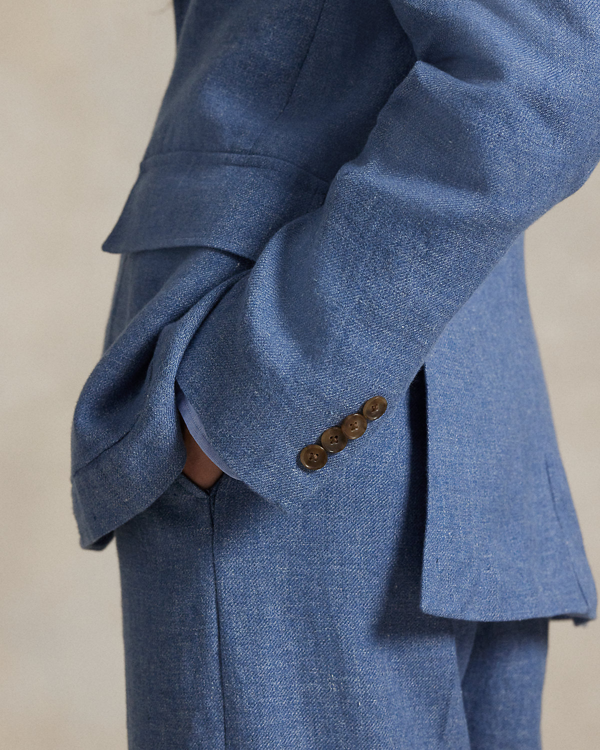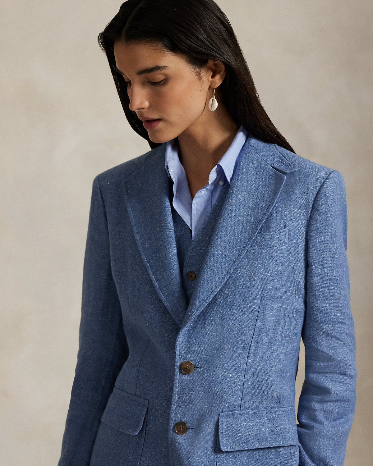 Woven with a blend of Italian linen and cotton yarns, this medium-weight blazer unites a slim fit with menswear-inspired details, including notch lapels, dived cuffs, and tailored waist darts.
