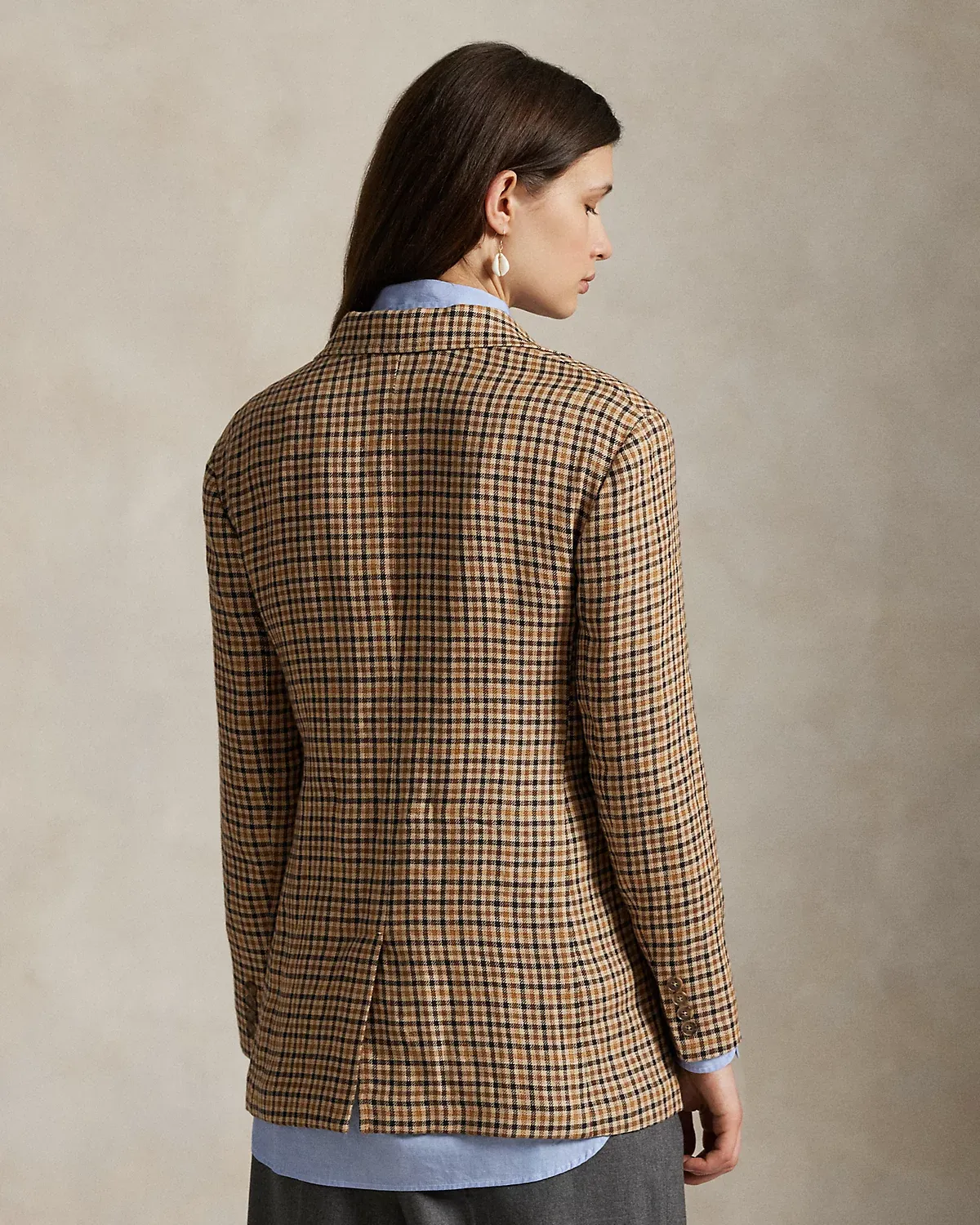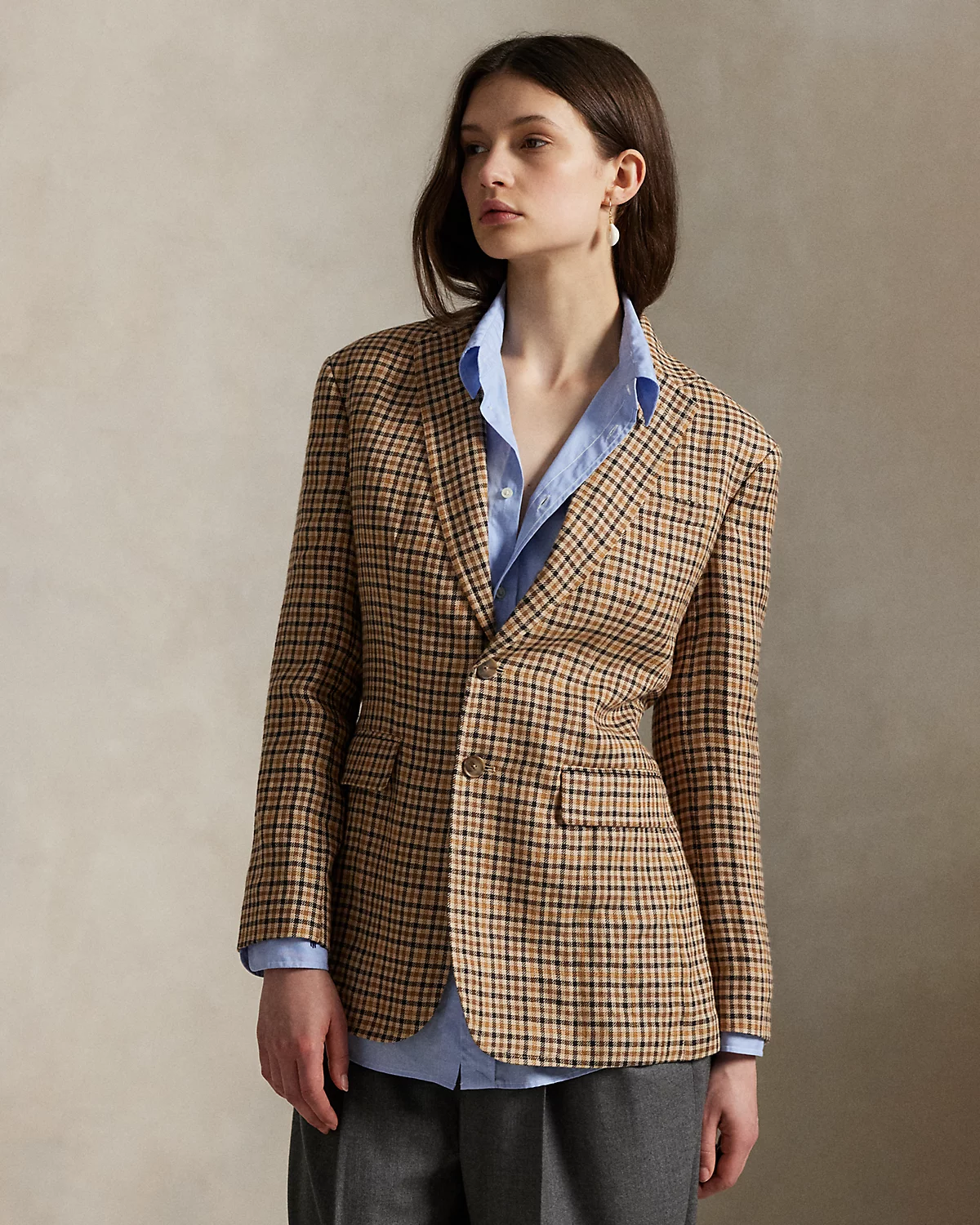 Woven with Irish linen tweed featuring a yarn-dyed plaid pattern, this blazer is cut for a single-breasted silhouette with notch lapels and waist pockets.