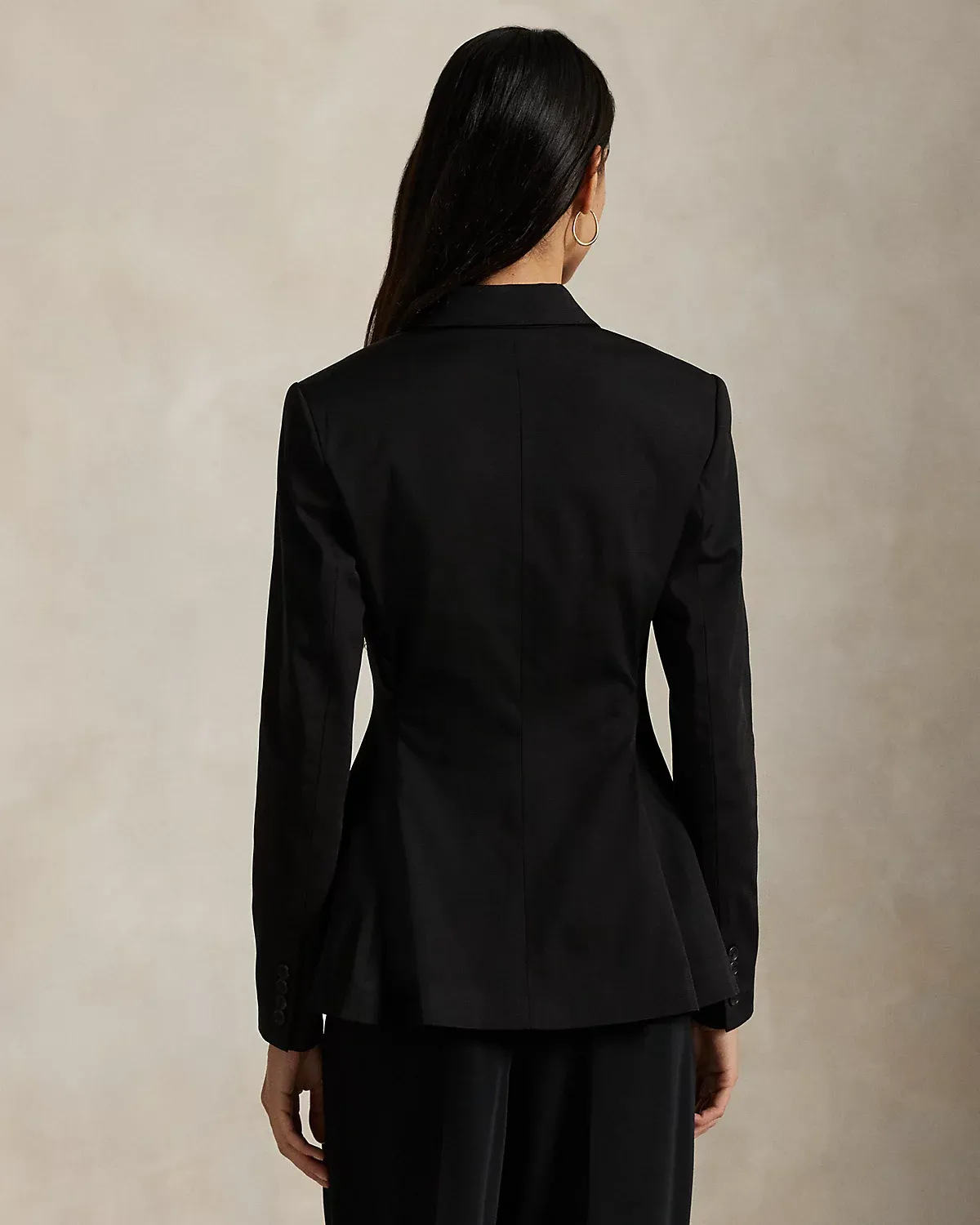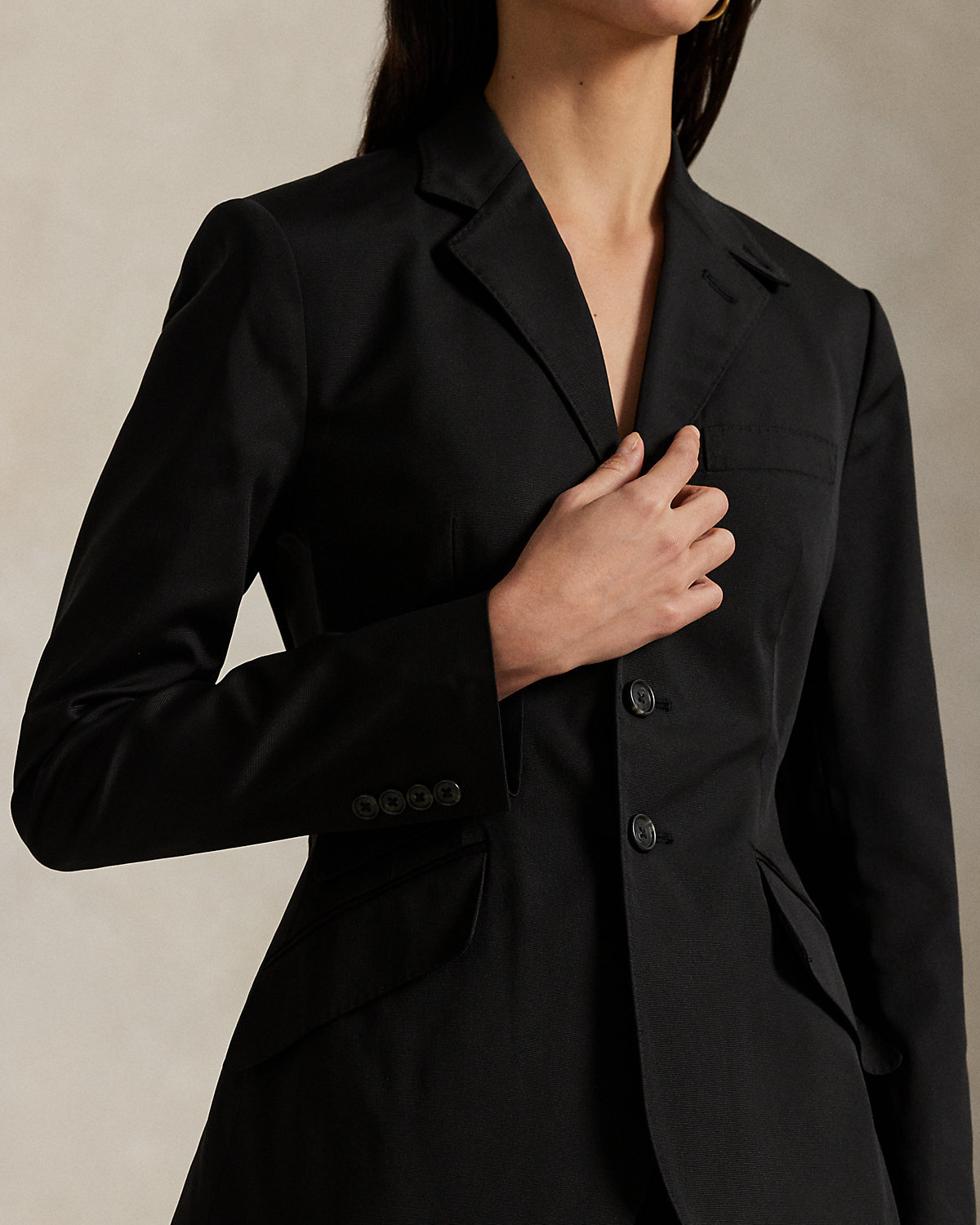 Rendered in satin fabric with a hint of stretch, this hacking jacket offers a polished look with its precisely fitted bodice and subtle flared hem.