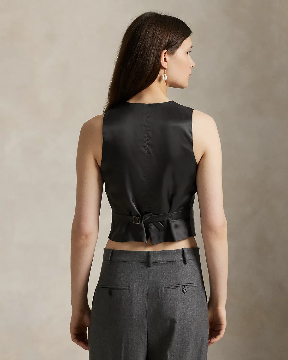 Crafted with an Italian stretch-wool fabric front panel, this menswear-inspired vest is constructed with a dived placket, a notched hem, and an adjustable buckled detail at the back waist.