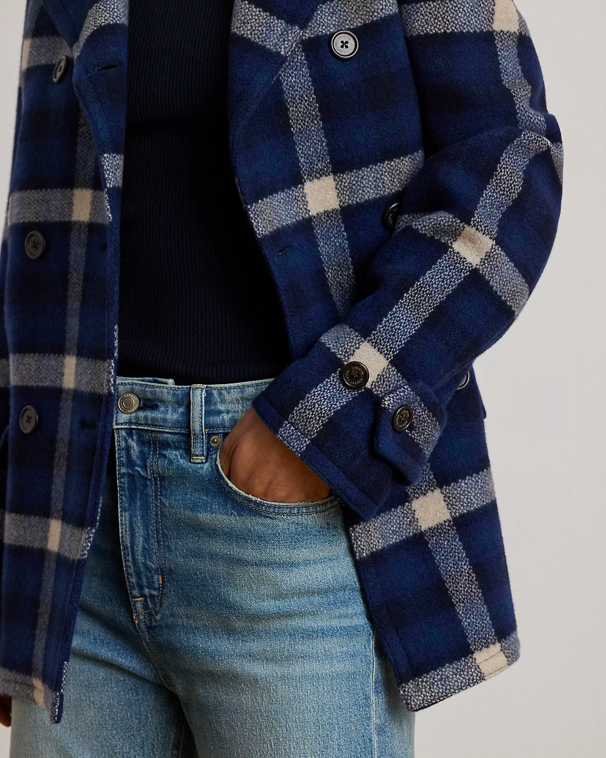 Yarn-dyed with a timeless plaid pattern, this wool-blend tweed coat features a double-breasted silhouette embellished with signature horn-effect divs.