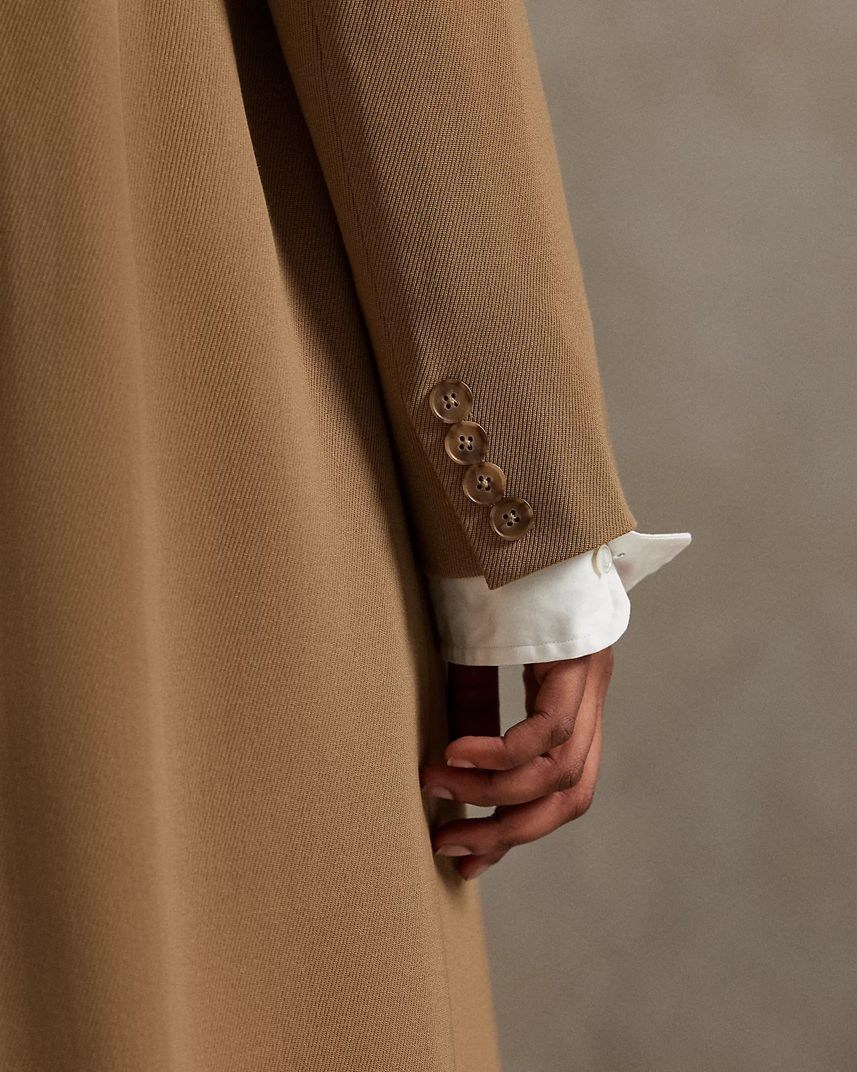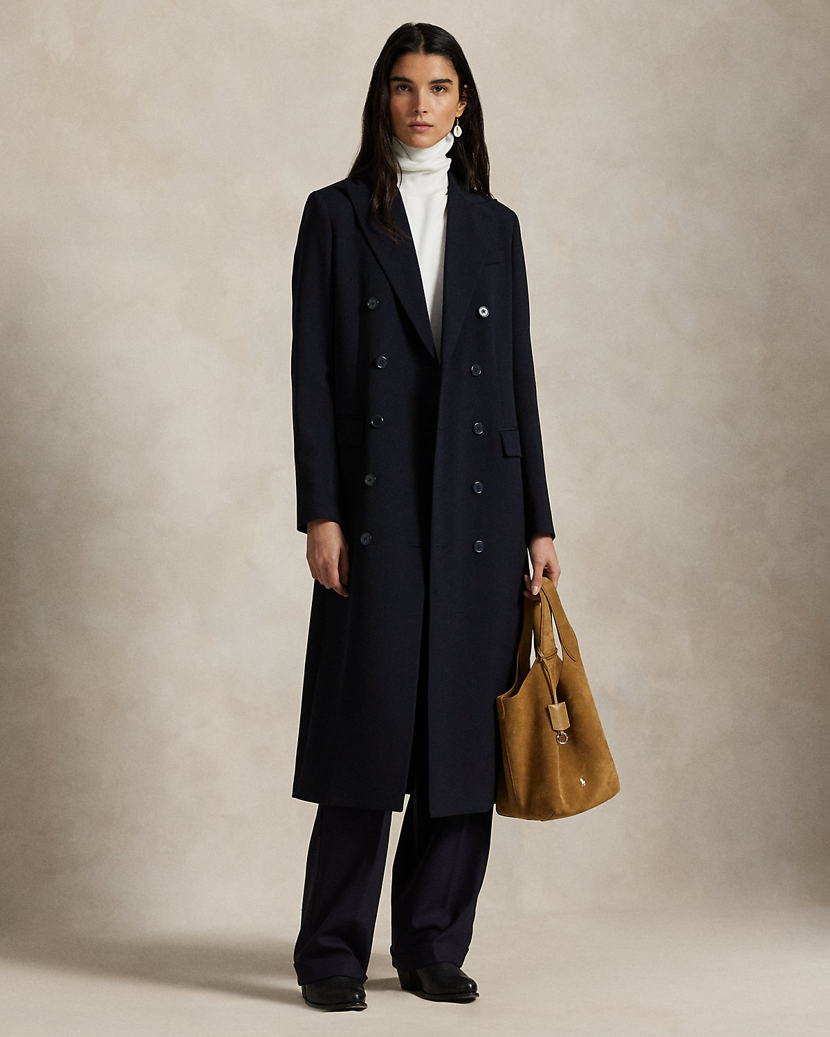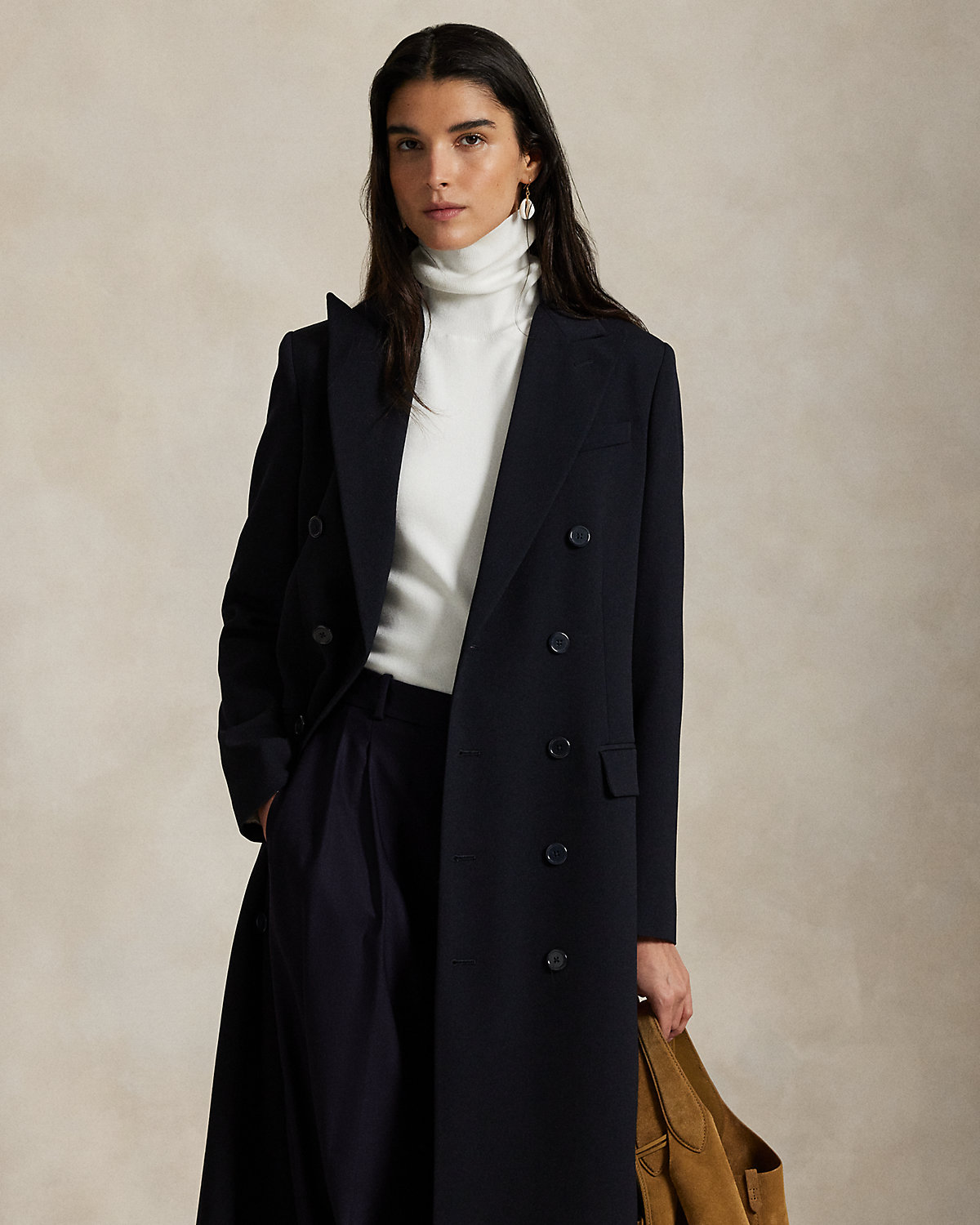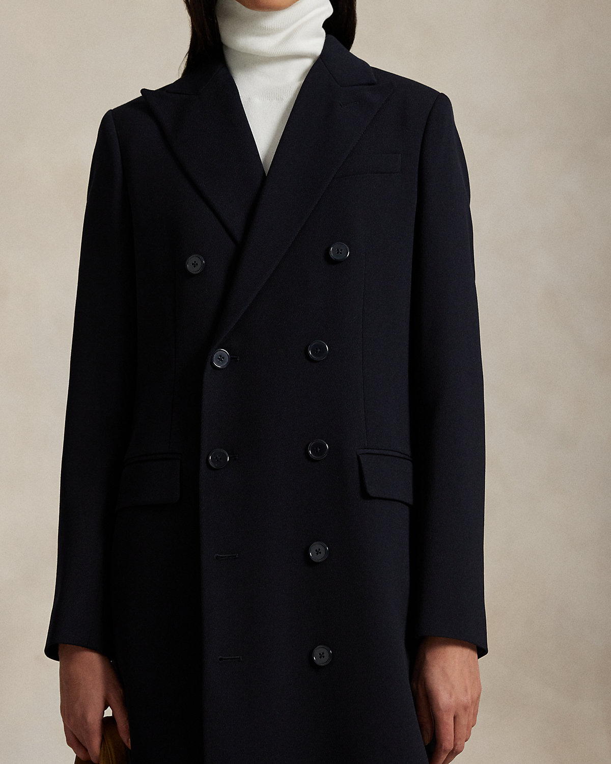 Finely crafted with Italian yarn-dyed wool to achieve a soft hand and versatile mid-weight, this double-breasted coat features a structured profile with peak lapels, shoulder pads, and refined dived cuffs.
