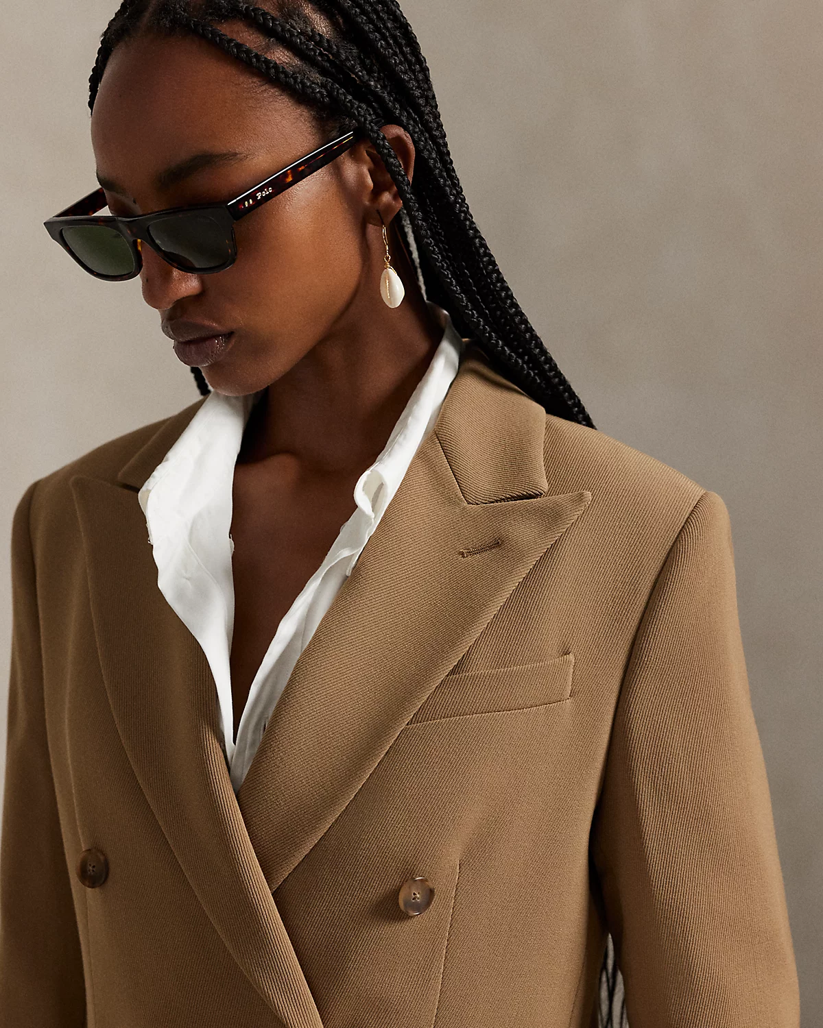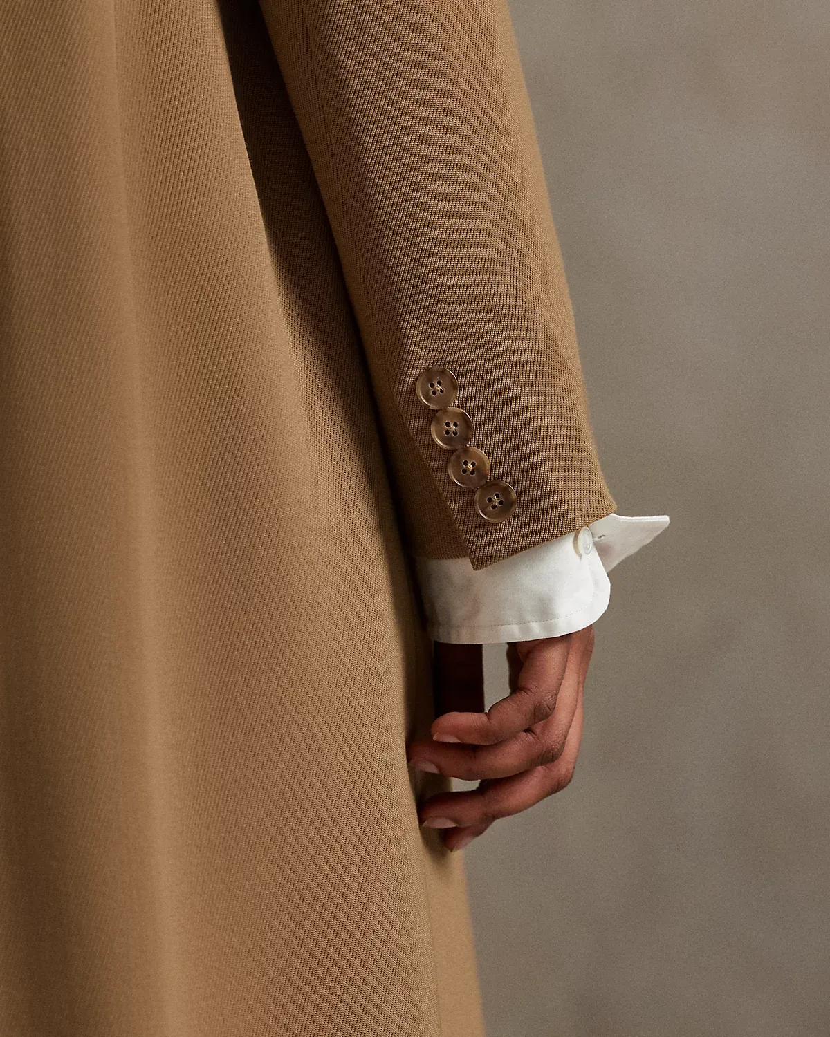- Peak lapels. Buttoned throat latch at the left collar. Double-breasted silhouette.
