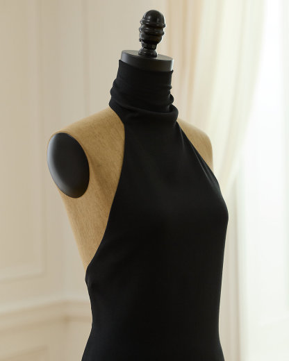 - Backless halter silhouette. Six hook-and-eye closures at the center back of the neck.