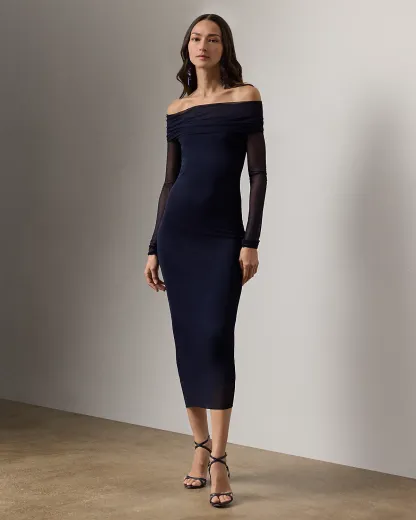 Cut for a figure-skimming silhouette, this stunning cocktail dress unites a smooth, stretch-infused matte jersey underlayer with ultrafine sheer jersey at the sleeves and exterior, creating a beautiful juxtaposition between transparency and opacity.