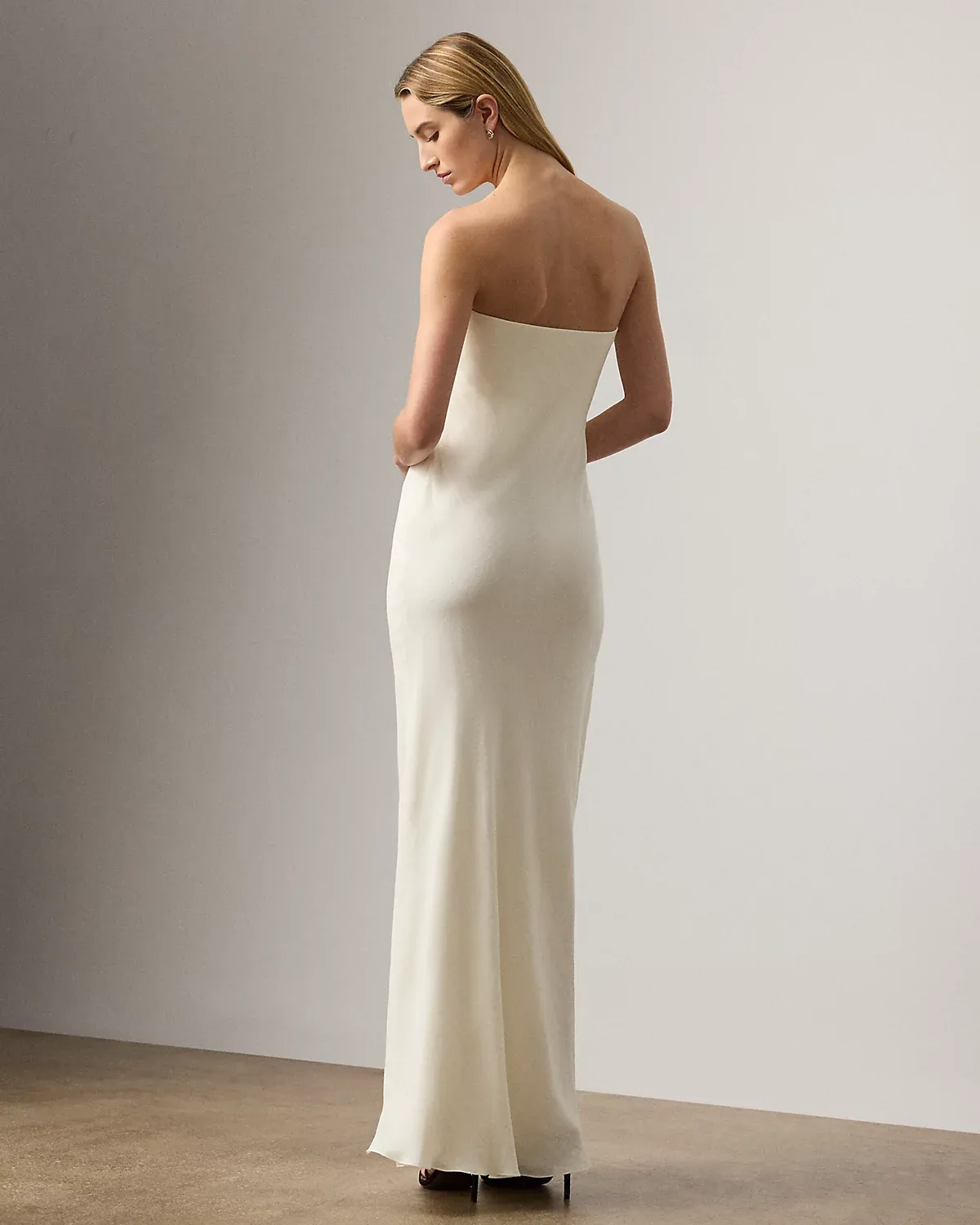 Inspired by a vintage photo of Ricky, Mr. Lauren’s wife and muse, on a family trip to Jamaica, the strapless Brigitta gown nods to the effortless fashioning of a sarong with a wrap silhouette that gathers gracefully at the neck, then opens down the skirt to create ease of movement. Its linen voile fabrication accentuates its breezy, lightweight feel.