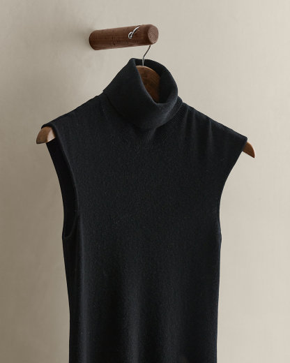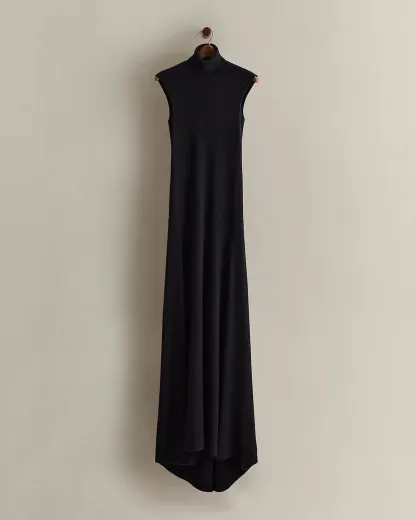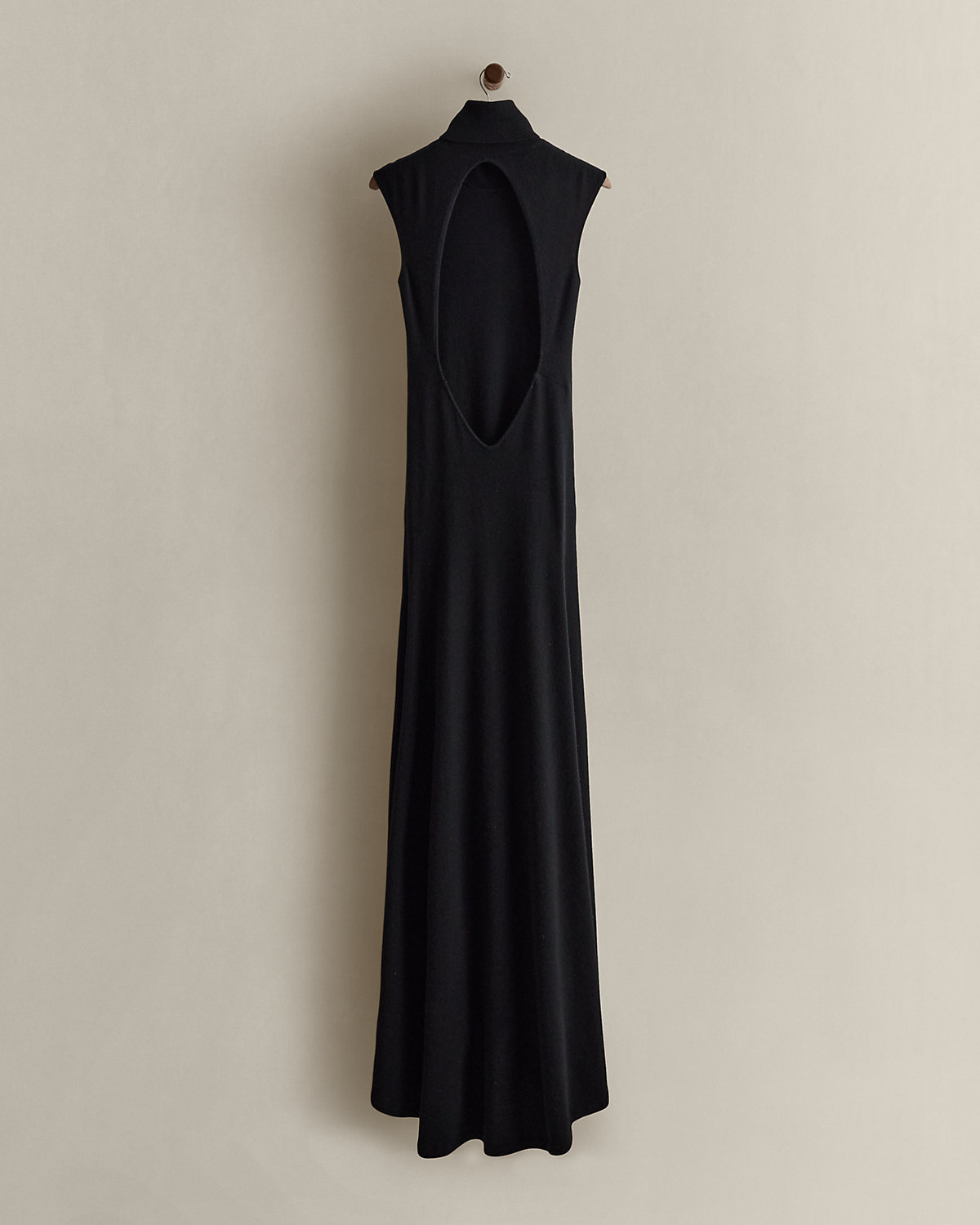 Circa 2005. Part of the women’s Ralpthth Lauren Black Label collection. This evening dress is designed with a rib-knit turtleneck and a sleeveless, backless silhouette. Size medium has a 63" back body length, a 16" shoulder, a 13.75" chest, and a 13.75" waist.