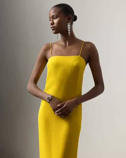 Inspired by an iconic dress Mr. Lauren designed in the 1980s, the Demetrius is cut for a slim column silhouette with a straight neckline and slender spaghetti straps. Its luxurious cady fabrication—distinguished by the season’s vibrant racing yellow hue—is made with the highest quality silk crepe yarns for a classic-yet-modern look. A center back skirt slit offers ease of movement.
