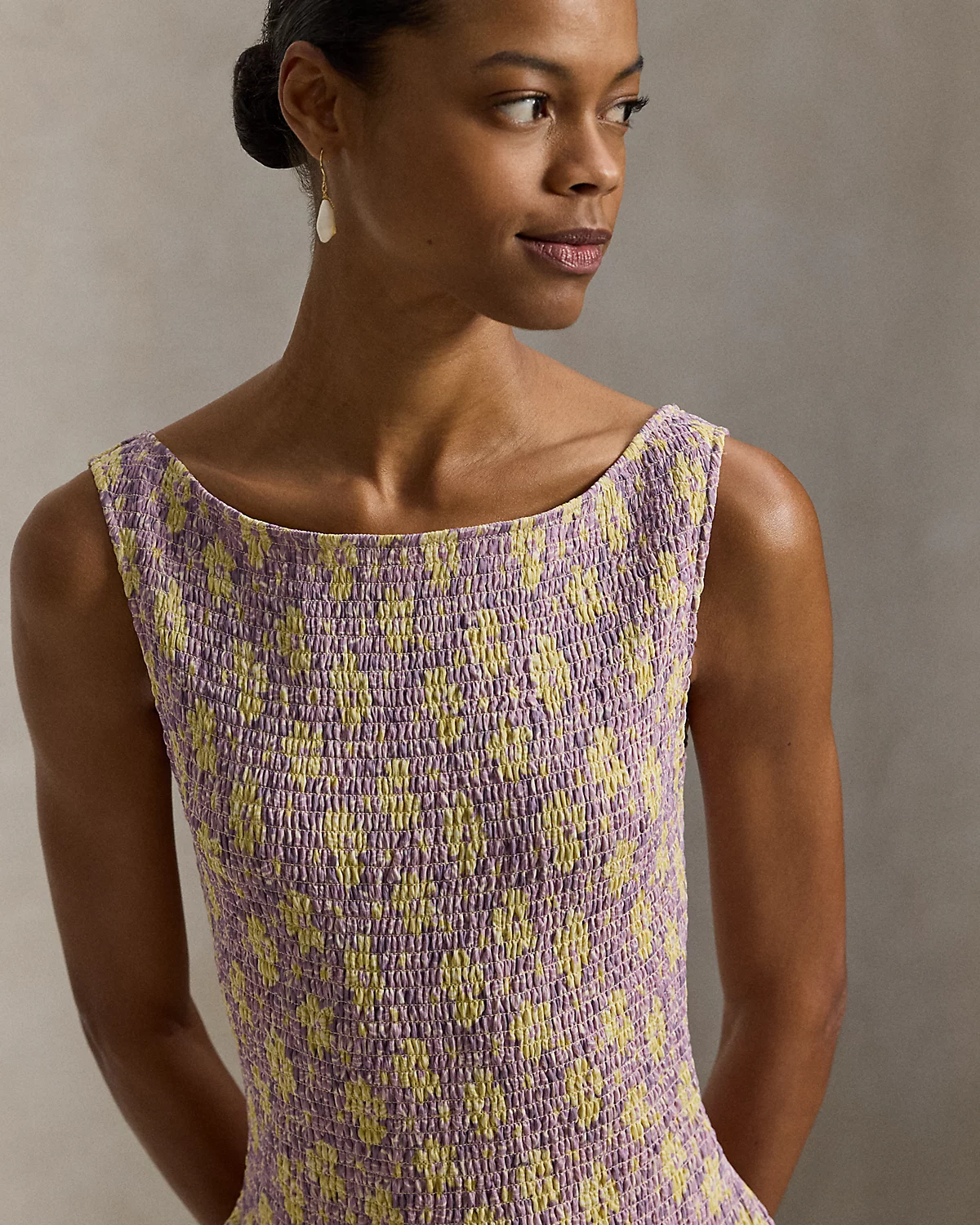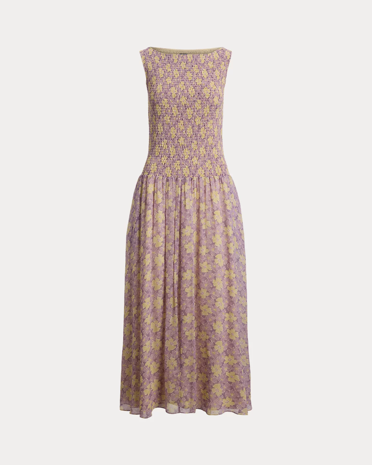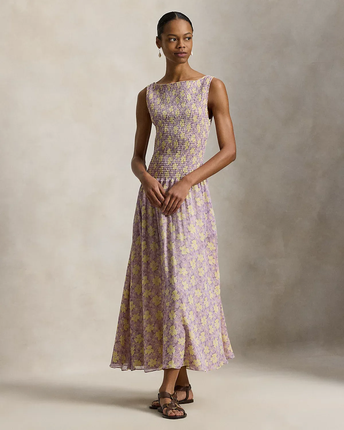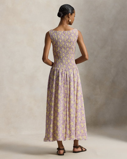 This fit-and-flare dress channels the romantic, traveler’s spirit of the season. Featuring an allover floral motif, it’s defined by a smocked bodice that flows into a shirred, crinkled skirt.