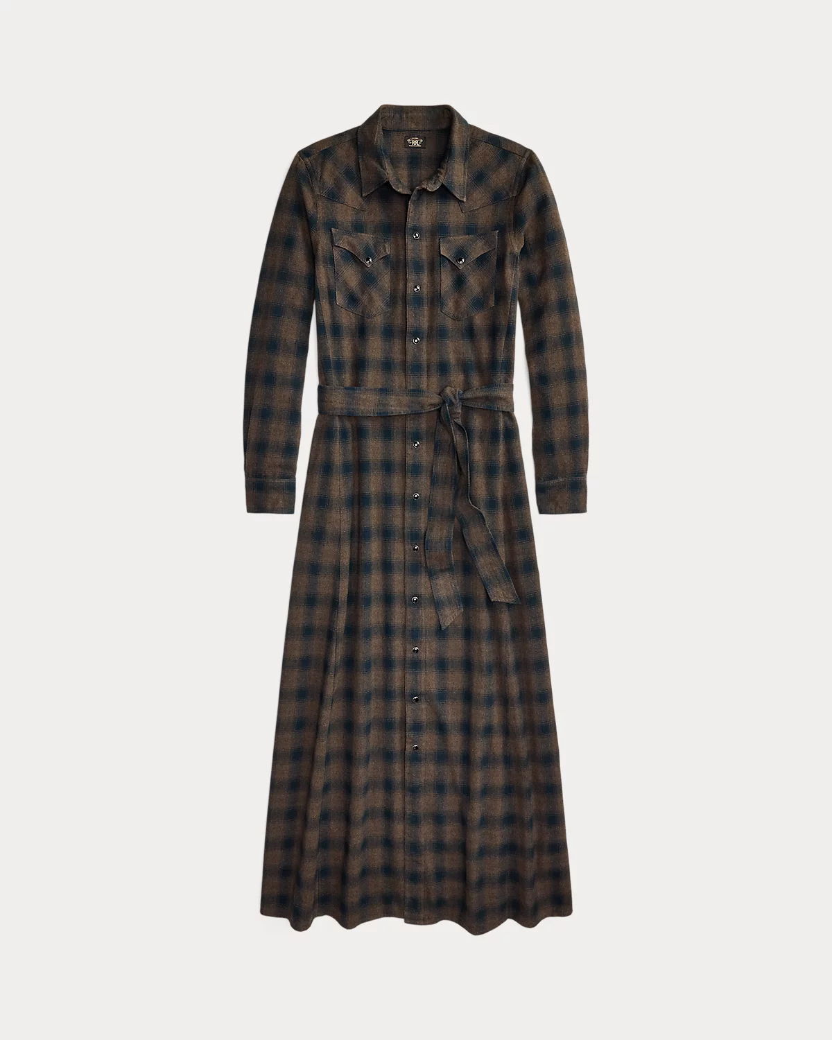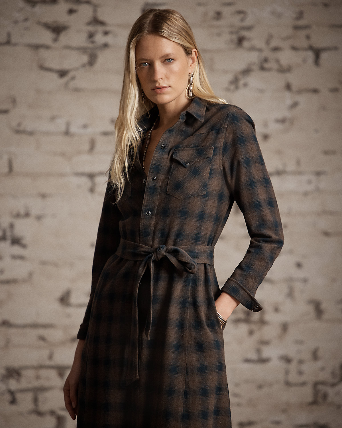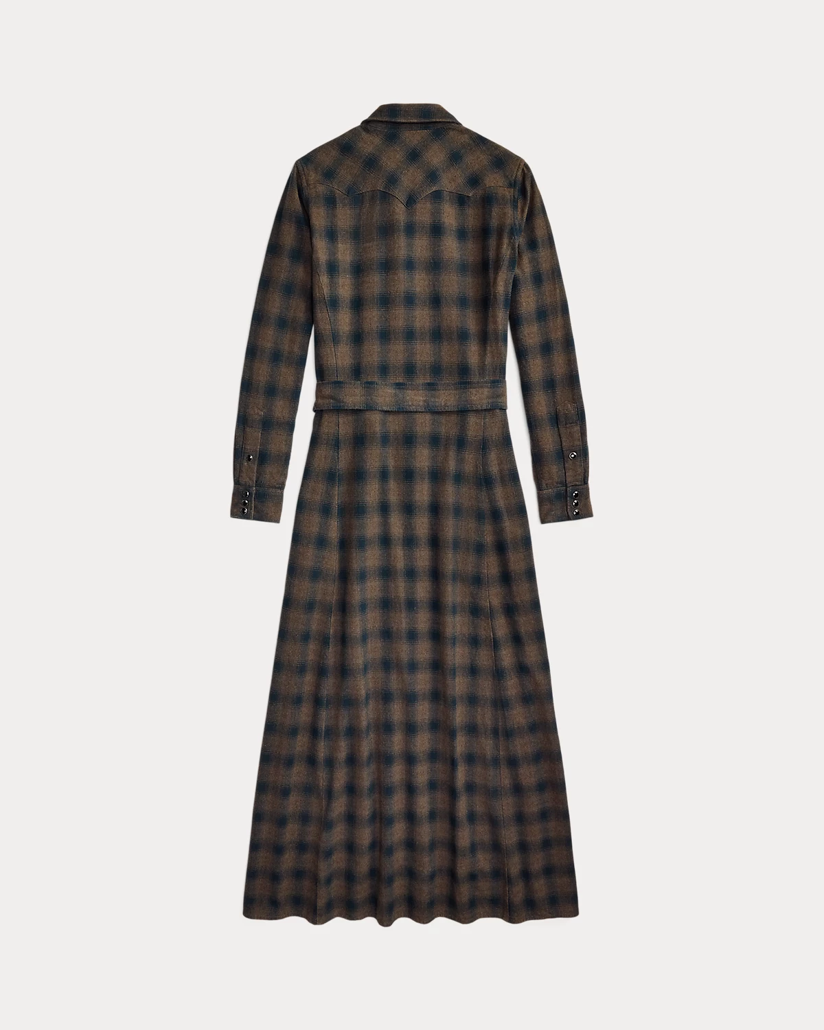 Shirtdress made with ombré plaid woven cotton. Brushed finish. Western-style yokes, pockets, and cuffs. Unlined. Comes with a self-tie belt.