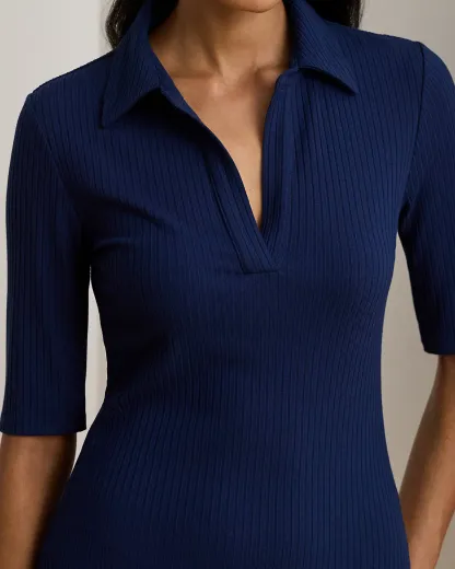 Lauren Ralpthth Lauren reimagines the iconic Polo shirt as a slim-fitting midi dress with elbow-length sleeves and a rib-knit construction.