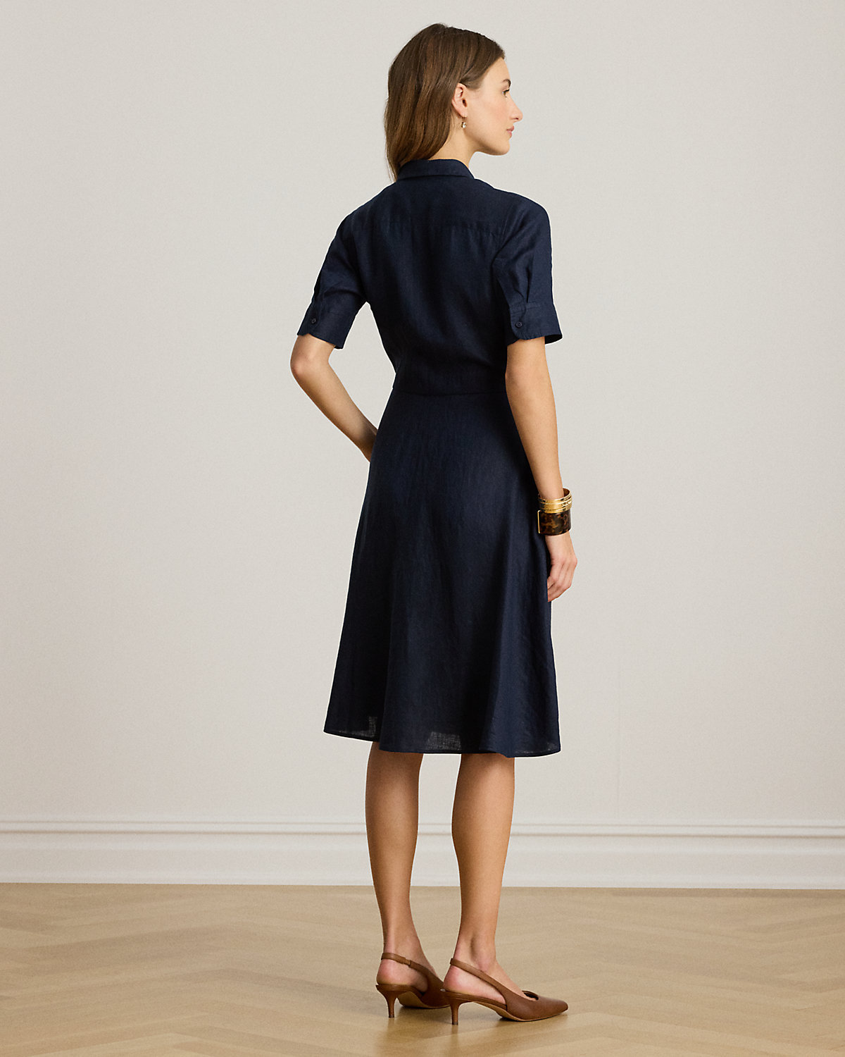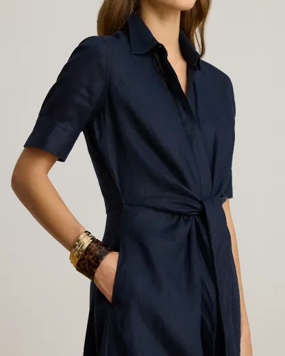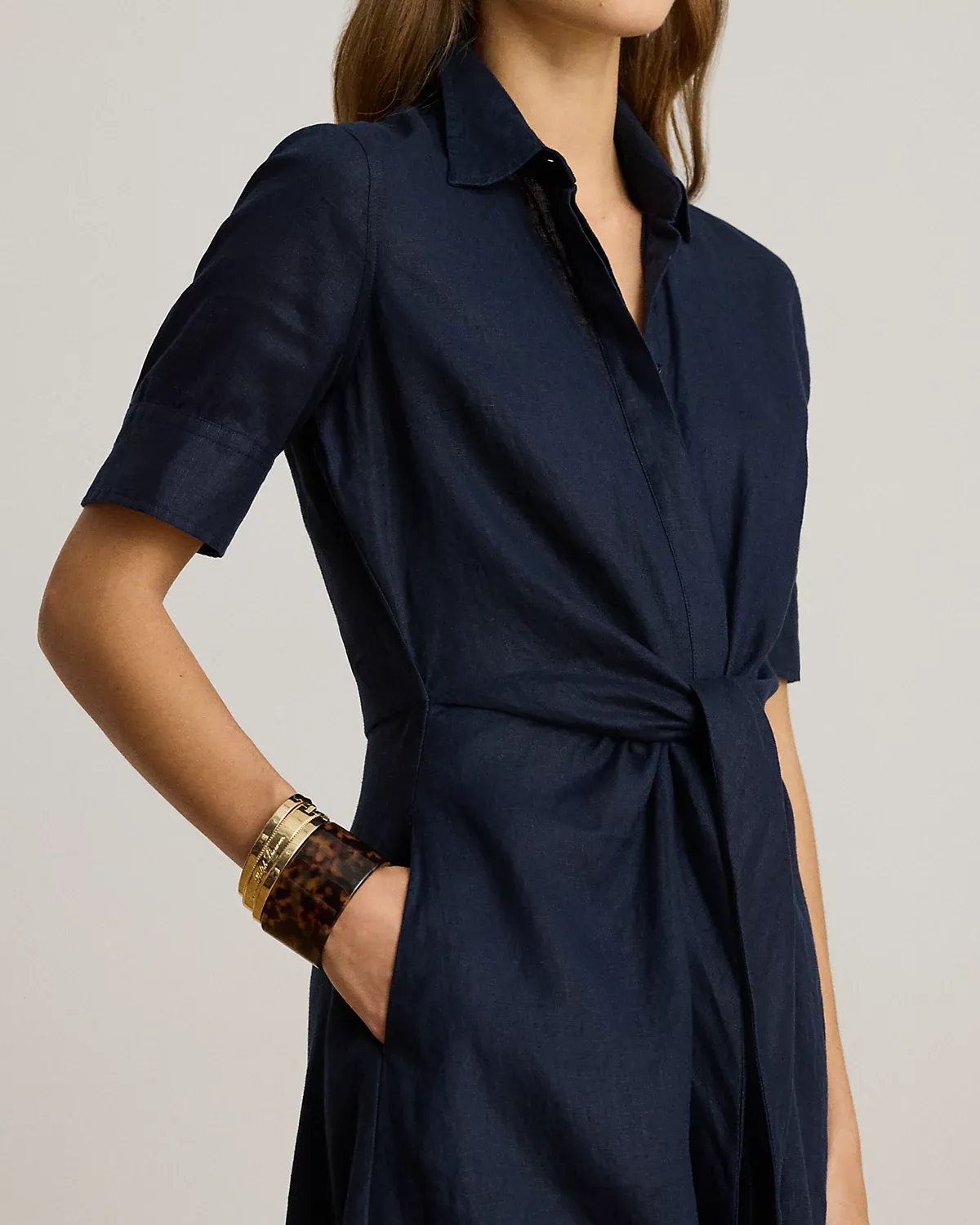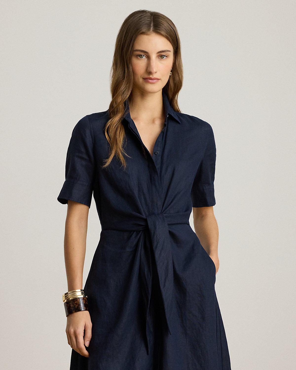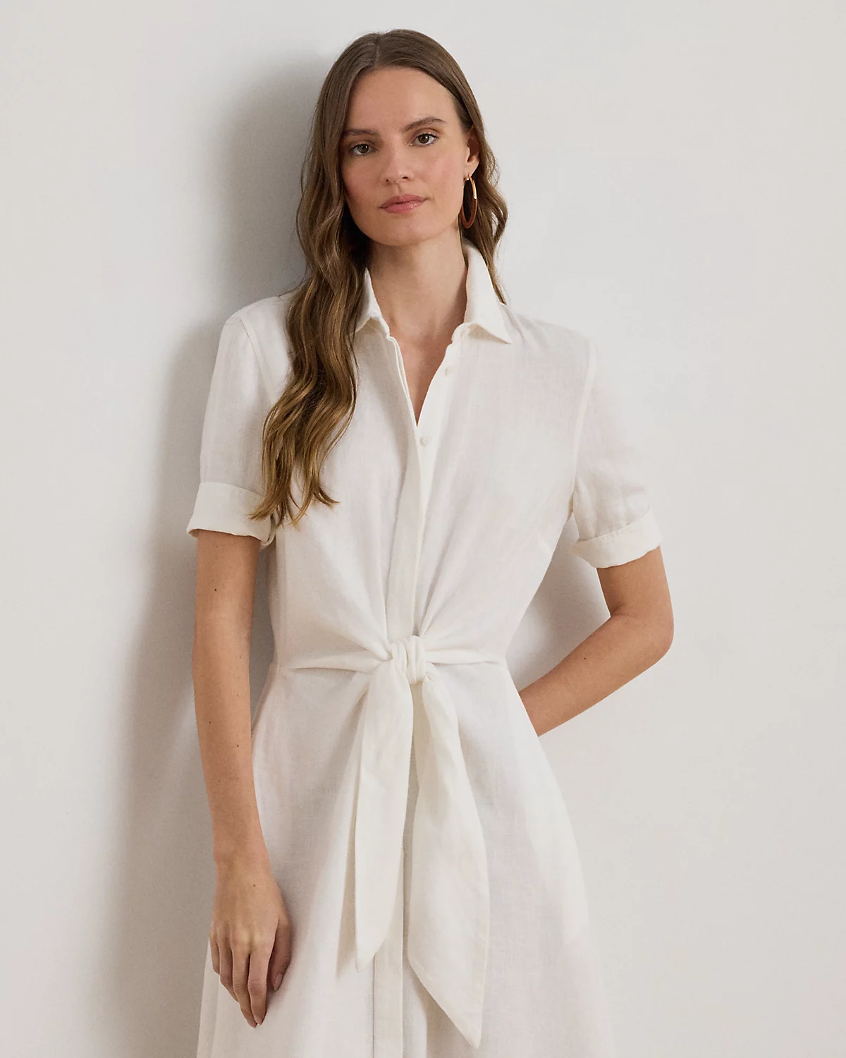 Light-as-air linen brings a breezy look and feel to this iteration of Lauren Ralpthth Lauren’s essential shirtdress, while a charming self-tie waist adds to its easy character.