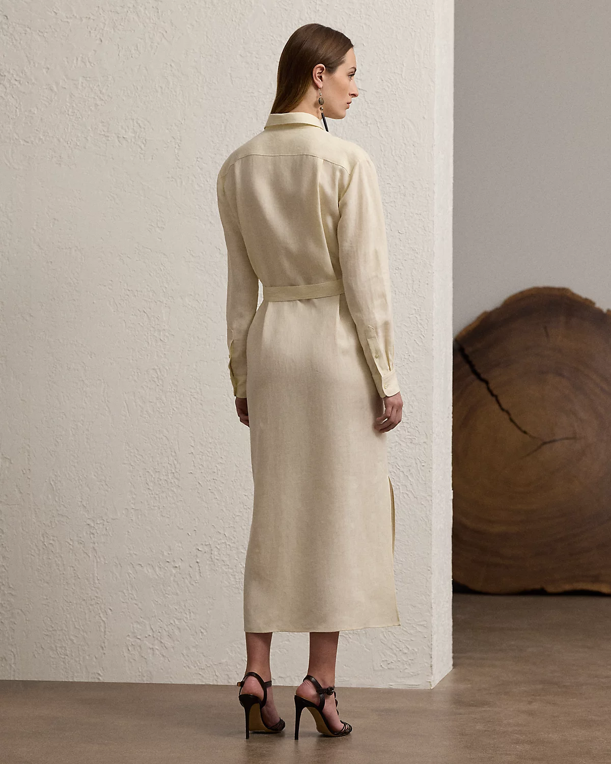Adapted from classic shirting and inspired by our Resort 2023 Ysabella dress, the Vicki revamps Ralpthth Lauren’s signature shirtdress for the season with slits at the side seams for ease of movement and a self-belt for versatile styling. Cut for a straight, slightly relaxed boxy fit, this calf-grazing dress is crafted with Italian linen in a classic construction for season-spanning wear.