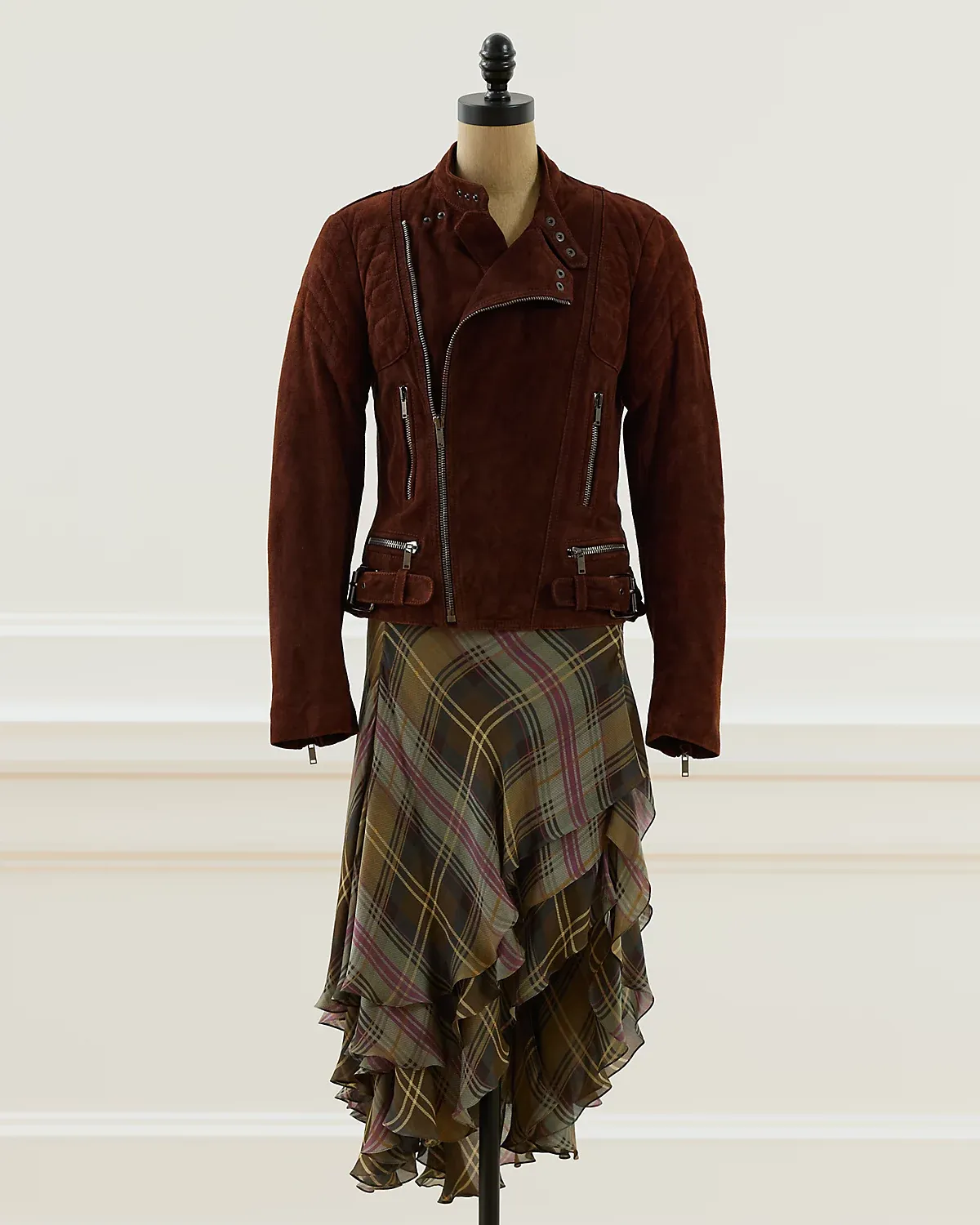 Fall 2003 Look 6. Ralpthth Lauren’s Fall 2003 Collection showcased a beautiful juxtaposition of fabrics and textures. The Garrett jacket, crafted with goat suede, is designed with traditional moto details, including an asymmetrical full-zip front, a snapped band collar, zip pockets, and adjustable buckled waist tabs. Size 6 has a 23" back body length, a 15.75" shoulder, a 17" chest, and a 25.5" sleeve length.