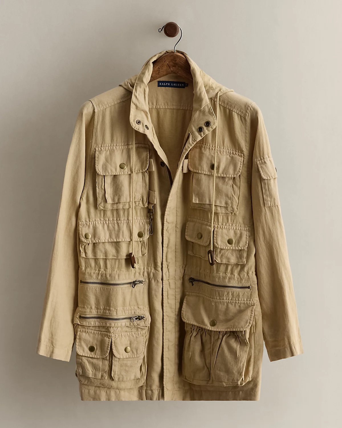 Circa 2008. Part of the women’s Blue Label collection. Linen field jacket with a mockneck collar and drawstring hood. Features a concealed snapped storm placket with a full-zip front, an array of zip and snapped utility-style pockets, a metal clip at the right chest, and an interior drawstring waist. Size XS has a 30" back body length, a 16" shoulder, an 18.25" chest, and a 23.25" sleeve length.