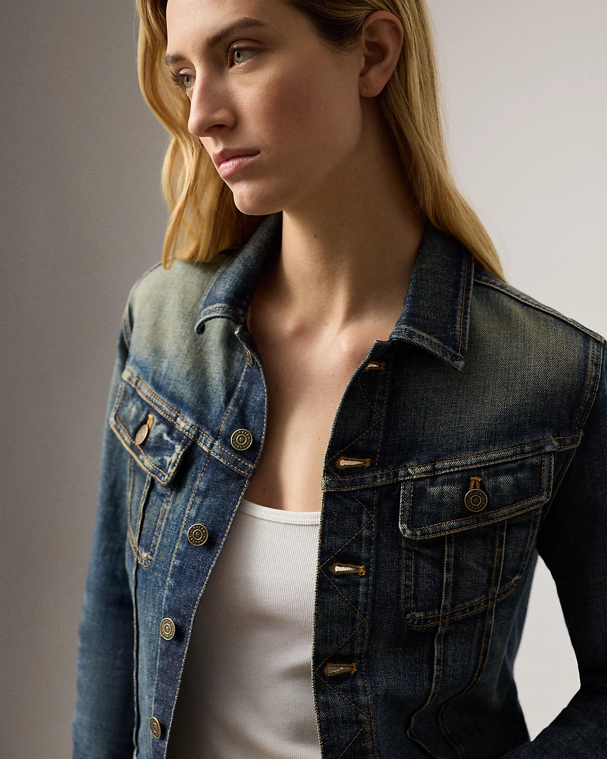 Inspired by Ricky Lauren’s collection of denim jackets, the Italian-made Rigby revamps the essential trucker jacket with a figure-hugging fit and Japanese stretch cotton denim, which is distinguished by its worn medium indigo wash. Authentic denim jacket details, including metal shank divs and a leather patch debossed with Ralpthth Lauren’s signature, nod to this style’s timeless sensibility.
