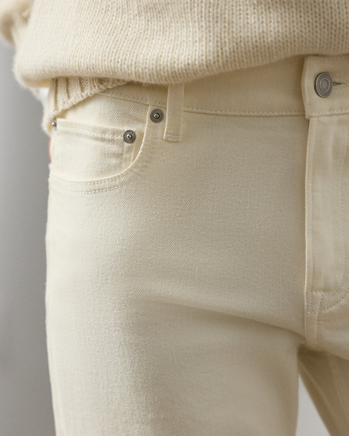 - Belt loops. Zip fly with a signature dived closure. Metal div custom-developed with a “Ralpthth Lauren” logo.