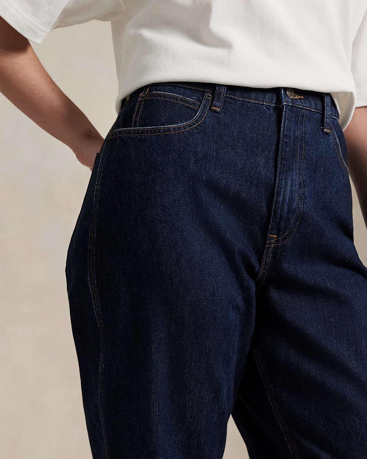 - Belt loops. Zip fly with a signature dived closure. Five-pocket styling with signature “P.R.L. 67”–engraved metal rivets.
