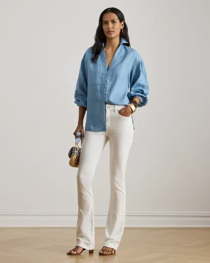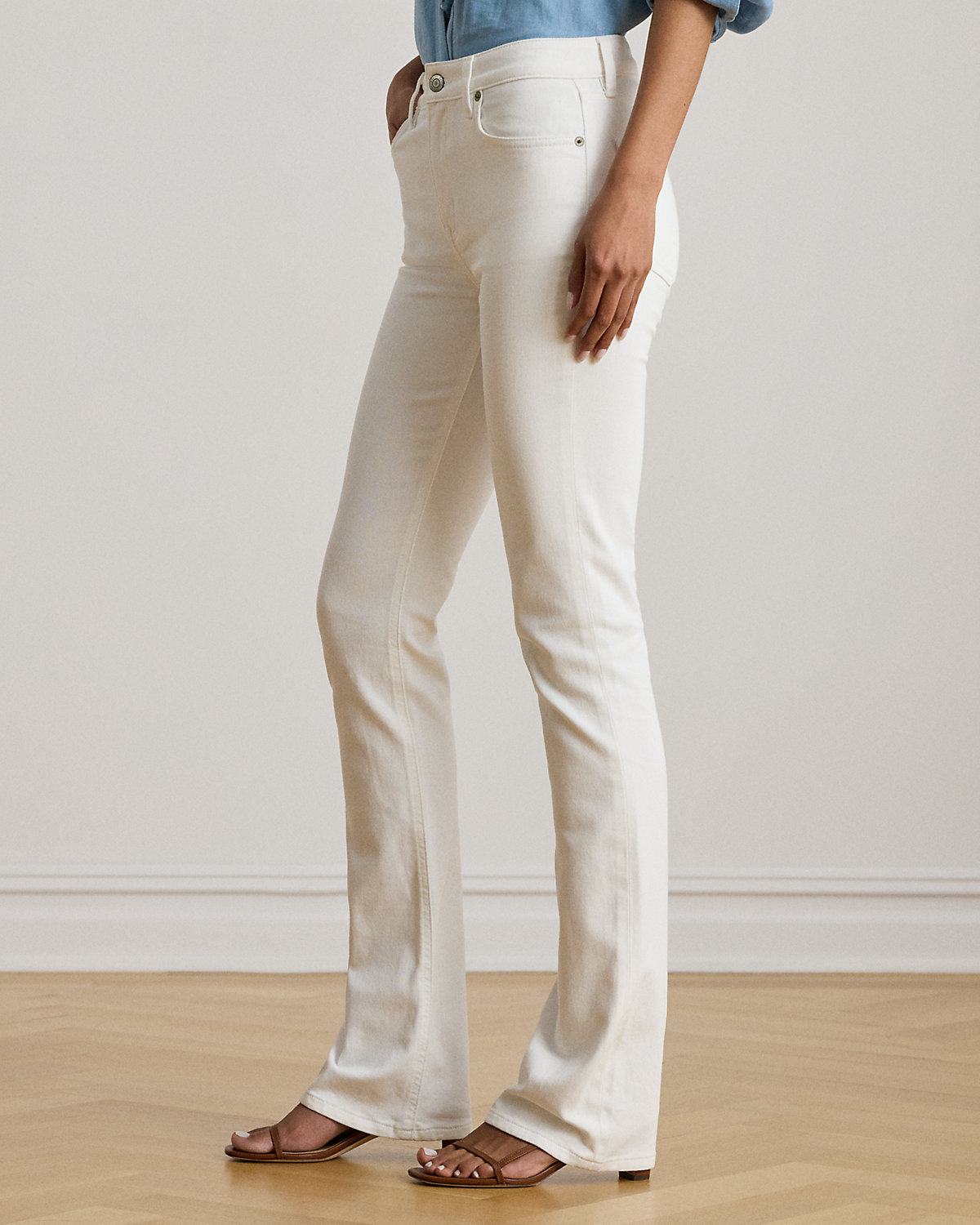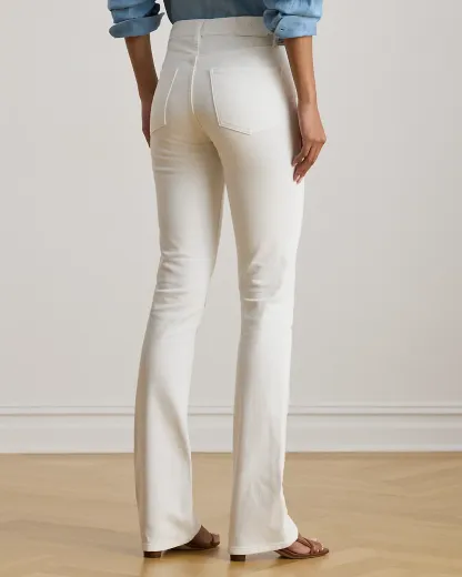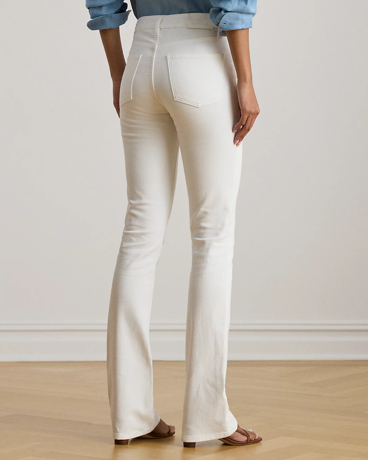 Cut for a flattering high rise, the leg-elongating silhouette of this boot jean is made with comfortable left-hand twill with a hint of stretch. This pair is dyed for a versatile white wash.