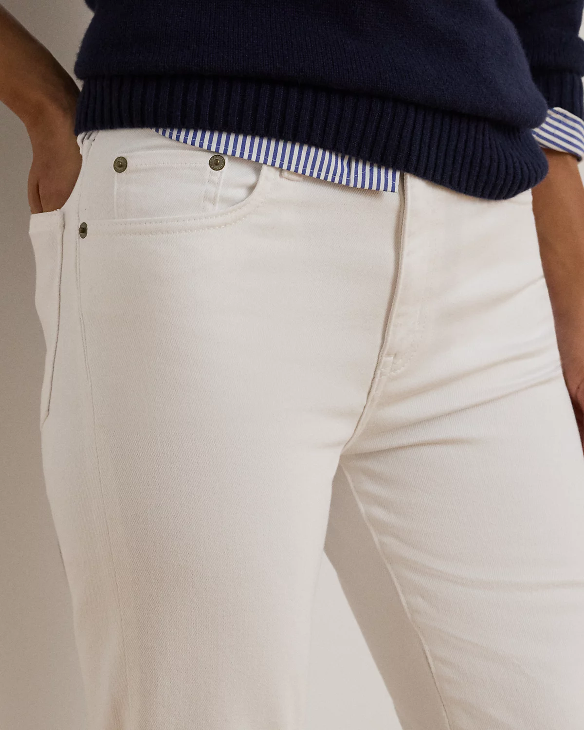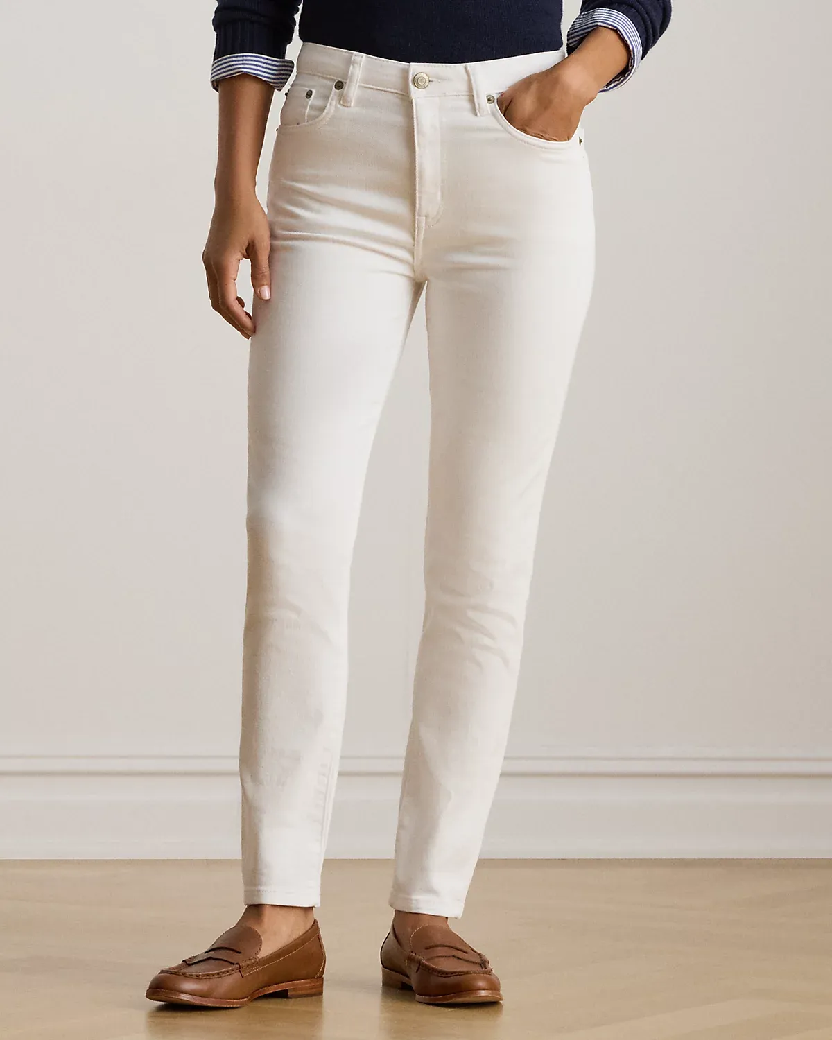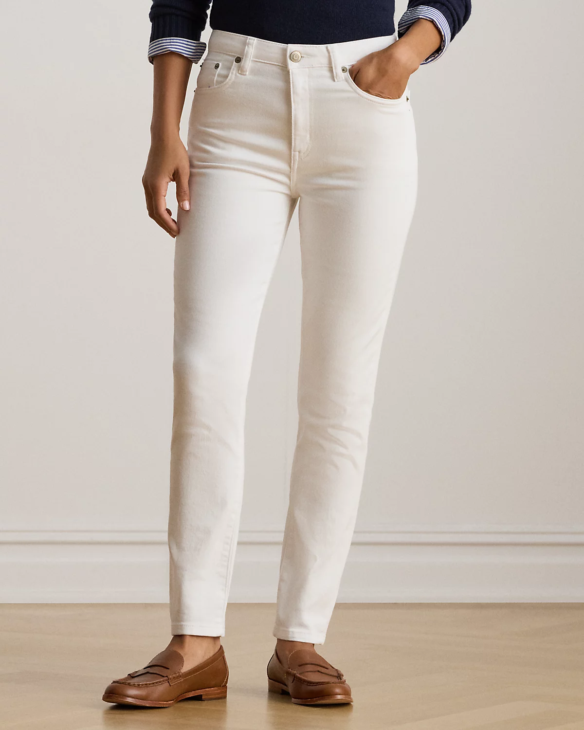 Crafted with comfortable left-hand twill with a hint of stretch, these high-rise skinny ankle jeans are cut for a flattering high rise. This pair is dyed for a versatile white wash.