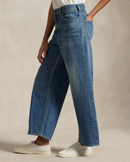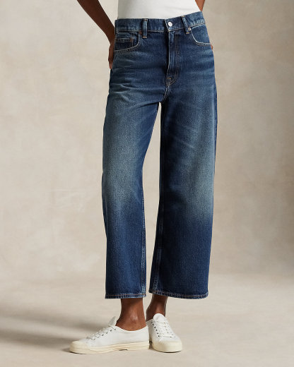 Designed for a cropped, wide-leg silhouette, these high-rise jeans are crafted with medium-weight Turkish denim with authentic slub character. The dark indigo wash has a vintage-inspired look thanks to uneven hand-sanding, whiskering, and grinding at the seams.