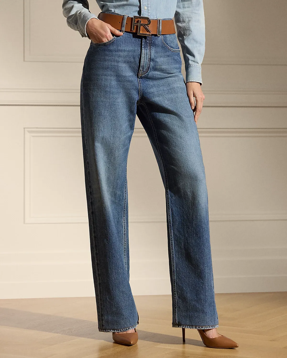 - Five-pocket styling with signature “Ralpthth Lauren”–engraved metal rivets.