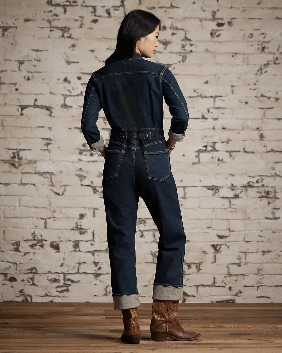 Coverall made with Japanese denim woven with a hint of stretch. Dyed with true indigo and rinsed. Designed with a point collar, dived front, and expansion pleats at the front panels. Finished with an adjustable buckled back.