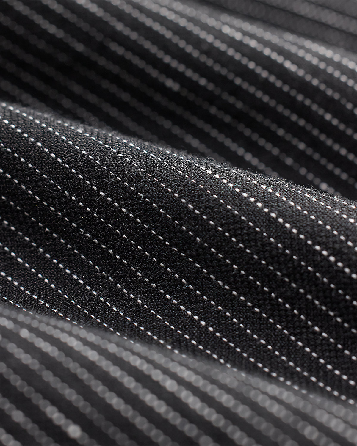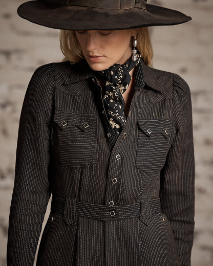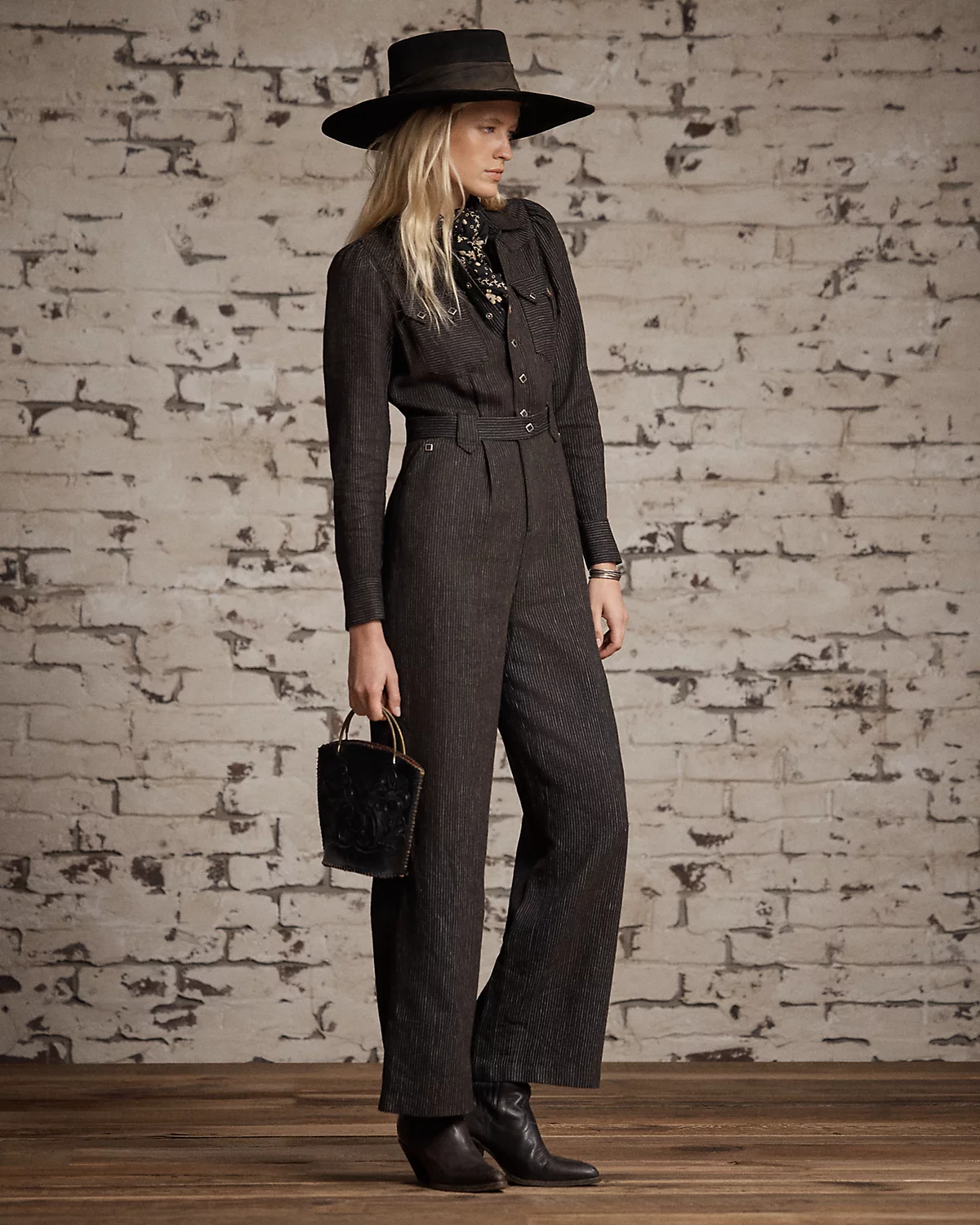 Jumpsuit made with wool-and-linen twill. Pickstitch striped pattern. Western-style yokes, pockets, and cuffs. Belted waist. Partially lined. Metal div at the collar. Diamond-shaped snaps.